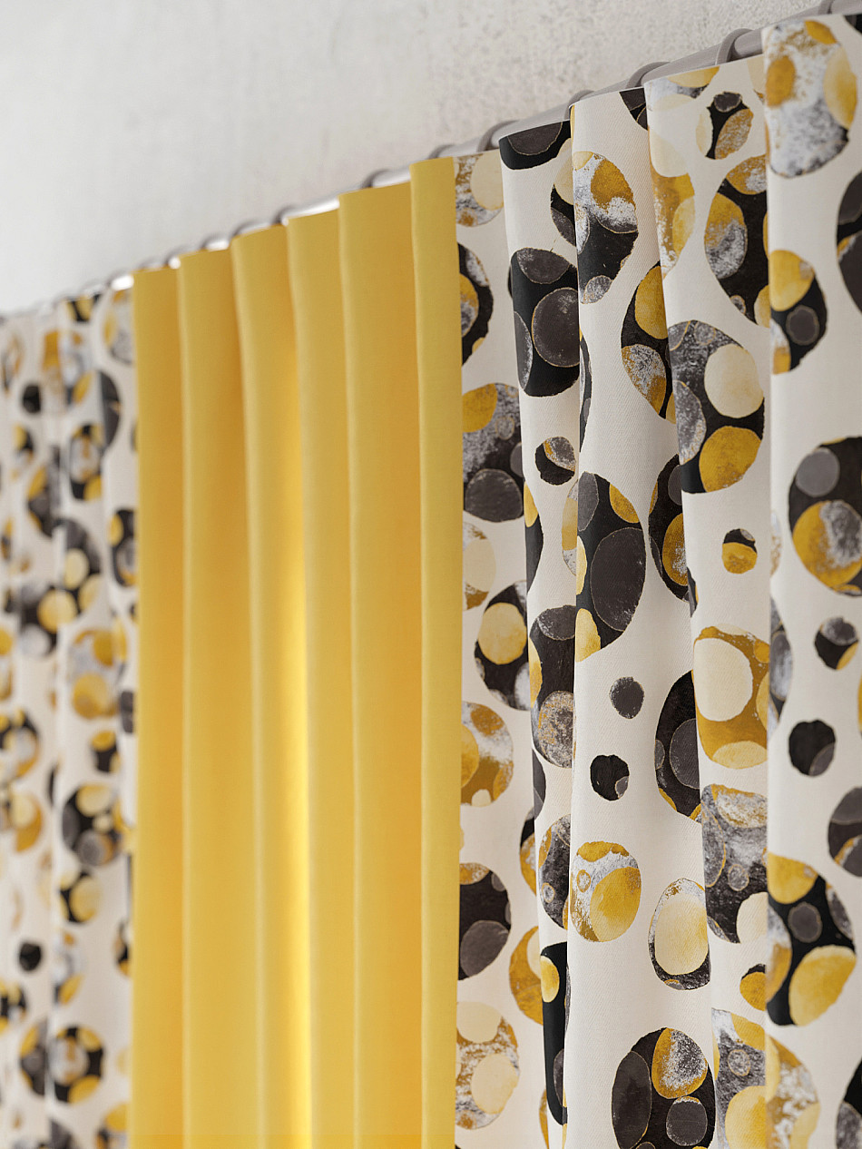 По верхнему краю портьер пришита шторная тесьма 6 см, с ее помощью затянув узелки от кордовых нитей с обеих сторон и стянув их до нужного размера можно сформировать округлые складки, далее вставить крючки в кармашки и повесить на карниз. Обязательно проверьте кордовые нити – они должны быть надежно завязаны, в противном случае во время стягивания они могут вылететь. Шторная тесьма имеет два ряда кармашков, с их помощью можно регулировать не только длину, но и ширину. Такое крепление подходит для всех типов карнизов.
