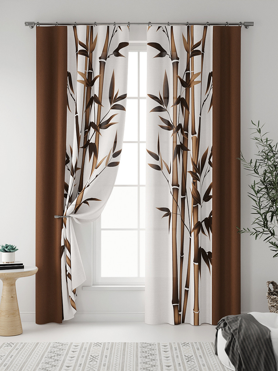 Комплект штор из легкой портьерной ткани (габардин) оформлен печатным рисунком. Печатный рисунок дает широкие возможности обновить интерьер фактически нет требуя ремонта за счет огромного выбора. Ткани с печатным рисунком безопасны и не содержат токсичных веществ. Не смотря на то что, материал легкий, он имеет высокую плотность, мало загрязнятся и не требует особого ухода даже после стирки, что важно для кухонных занавесок. Шторы не выцветают, не растягиваются, превосходно драпируются, образуя струящиеся складки. Прекрасное решение для создания красоты и уюта с помощью уникальных дизайнов.
