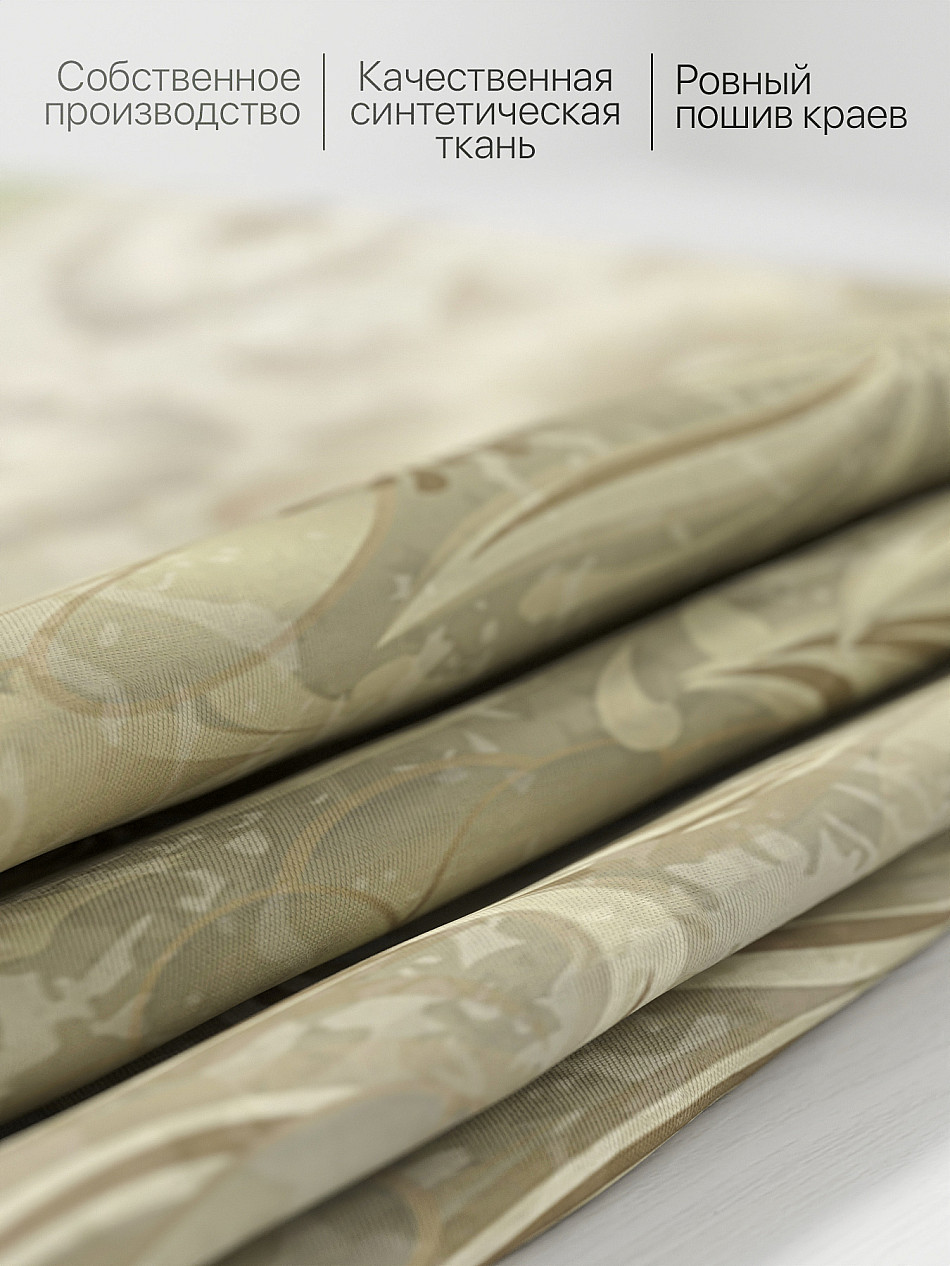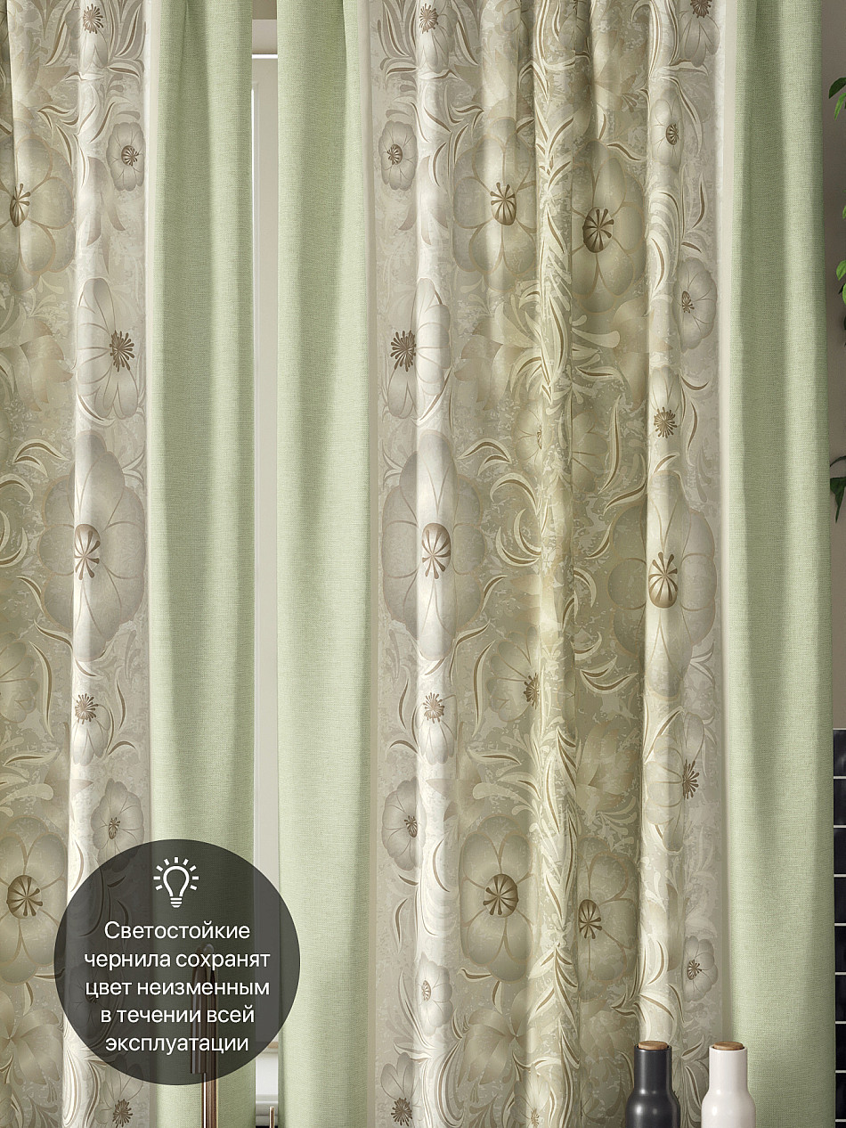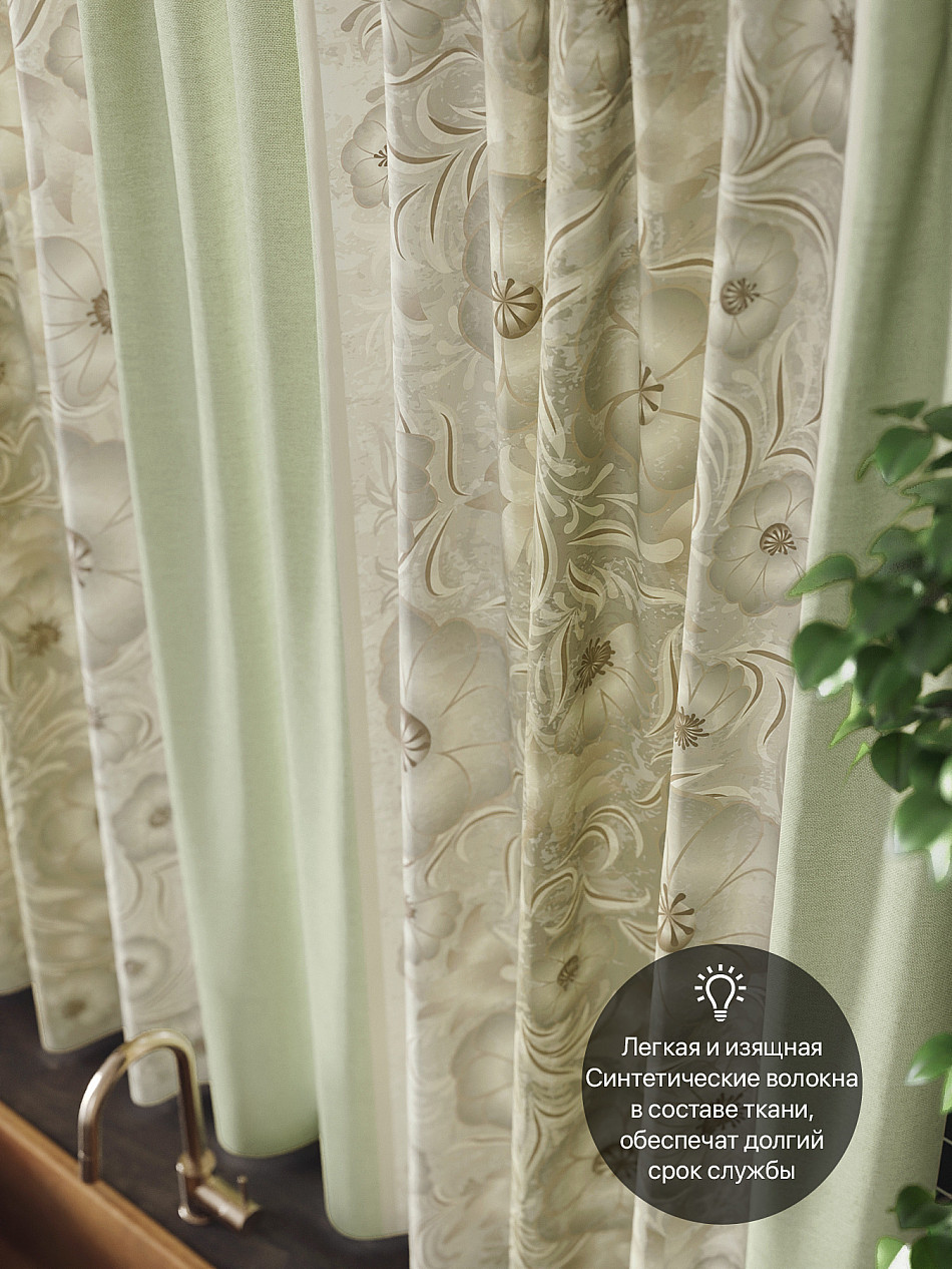 Комплект штор из легкой портьерной ткани (габардин) оформлен печатным рисунком. Печатный рисунок дает широкие возможности обновить интерьер фактически нет требуя ремонта за счет огромного выбора. Ткани с печатным рисунком безопасны и не содержат токсичных веществ. Не смотря на то что, материал легкий, он имеет высокую плотность, мало загрязнятся и не требует особого ухода даже после стирки, что важно для кухонных занавесок. Шторы не выцветают, не растягиваются, превосходно драпируются, образуя струящиеся складки. Прекрасное решение для создания красоты и уюта с помощью уникальных дизайнов.