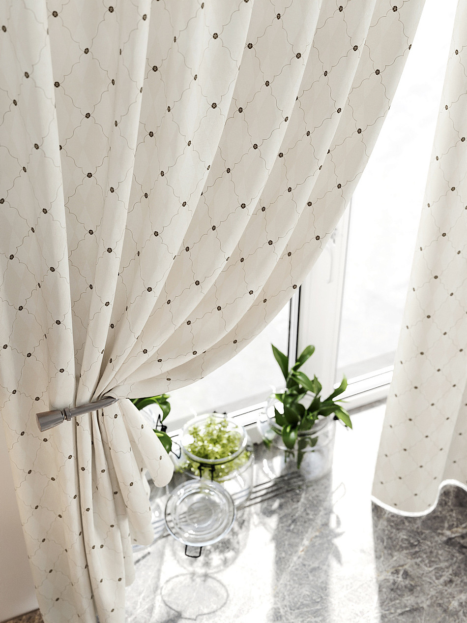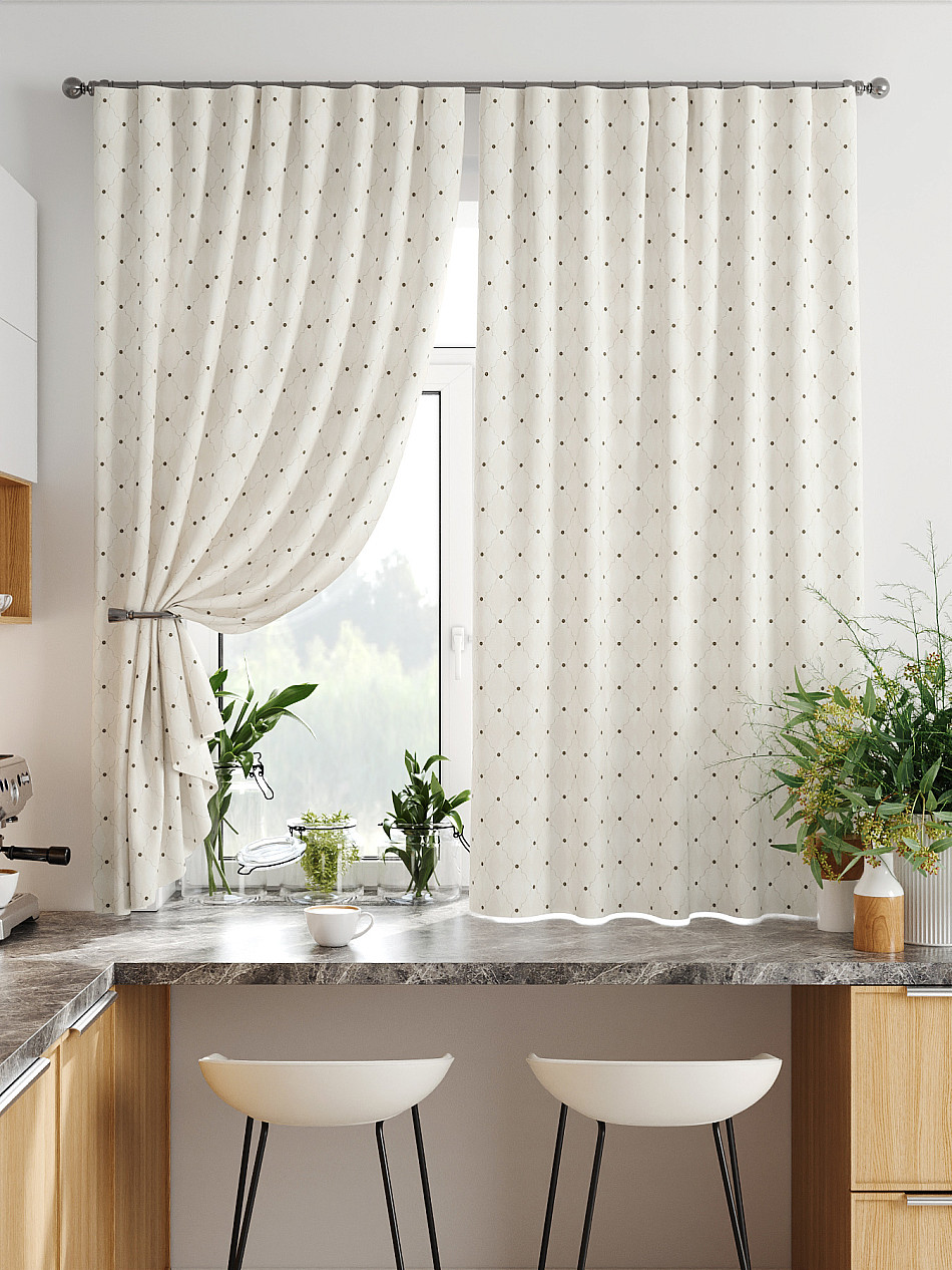 Комплект штор из легкой портьерной ткани (габардин) оформлен печатным рисунком. Печатный рисунок дает широкие возможности обновить интерьер фактически нет требуя ремонта за счет огромного выбора. Ткани с печатным рисунком безопасны и не содержат токсичных веществ. Не смотря на то что, материал легкий, он имеет высокую плотность, мало загрязнятся и не требует особого ухода даже после стирки, что важно для кухонных занавесок. Шторы не выцветают, не растягиваются, превосходно драпируются, образуя струящиеся складки. Прекрасное решение для создания красоты и уюта с помощью уникальных дизайнов.