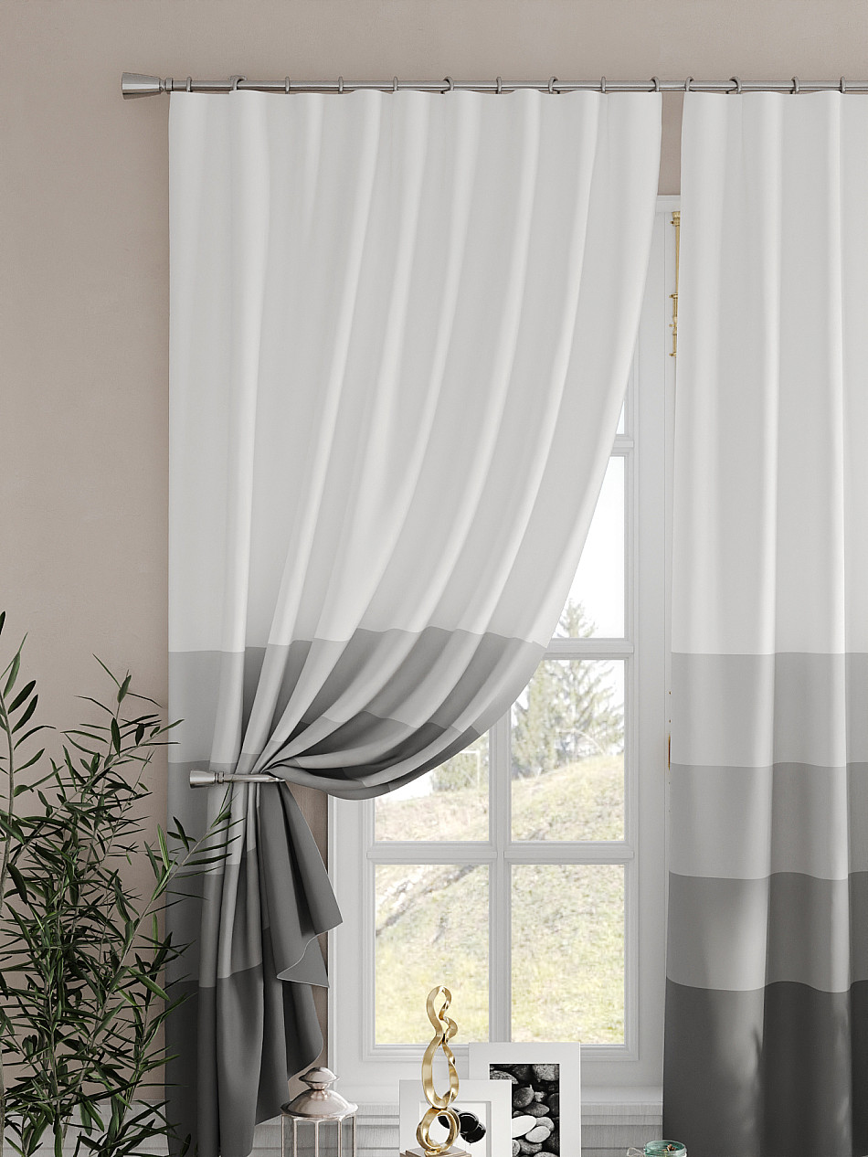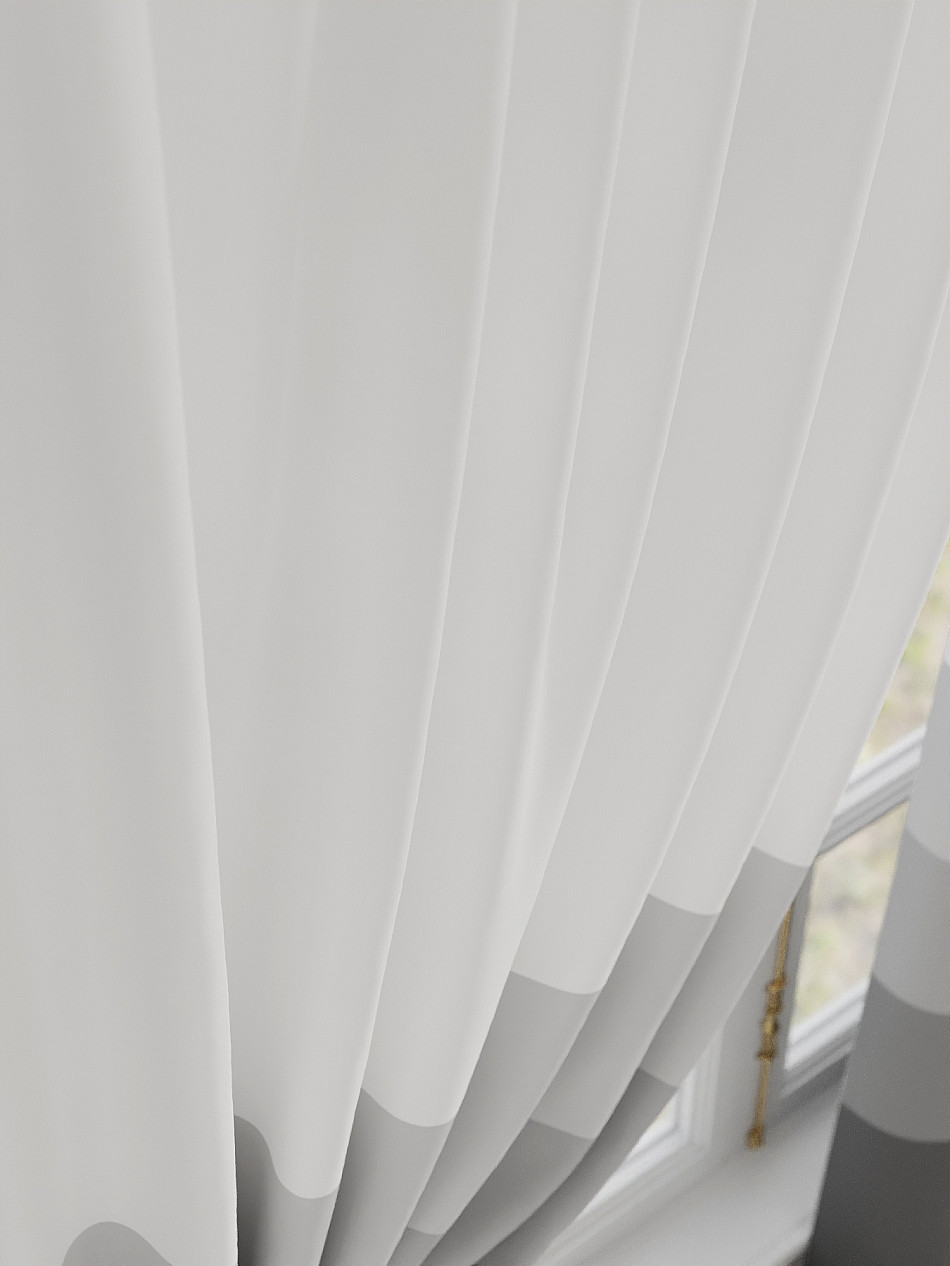 По верхнему краю портьер пришита шторная тесьма 6 см, с ее помощью затянув узелки от кордовых нитей с обеих сторон и стянув их до нужного размера можно сформировать округлые складки, далее вставить крючки в кармашки и повесить на карниз. Обязательно проверьте кордовые нити – они должны быть надежно завязаны, в противном случае во время стягивания они могут вылететь. Шторная тесьма имеет два ряда кармашков, с их помощью можно регулировать не только длину, но и ширину. Такое крепление подходит для всех типов карнизов.