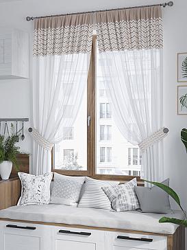Комплект штор из белой вуали дополнен портьерной тканью (габардин) с печатным рисунком. Шторы не выцветают, не растягиваются, превосходно драпируются образуя струящиеся складки. Прекрасное решение для создания красоты и уюта с помощью уникальных дизайнов.