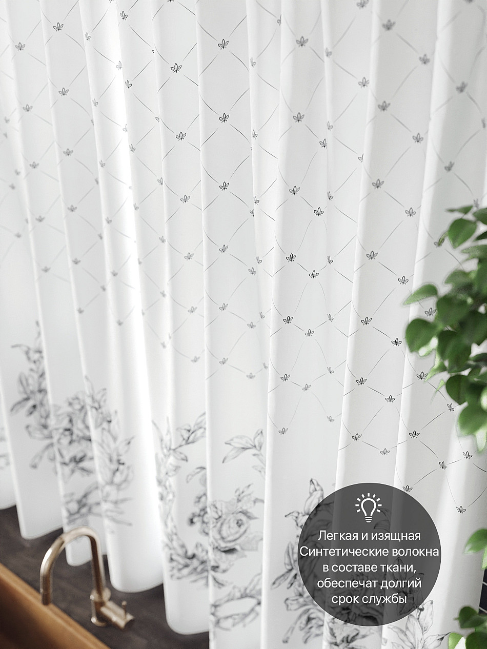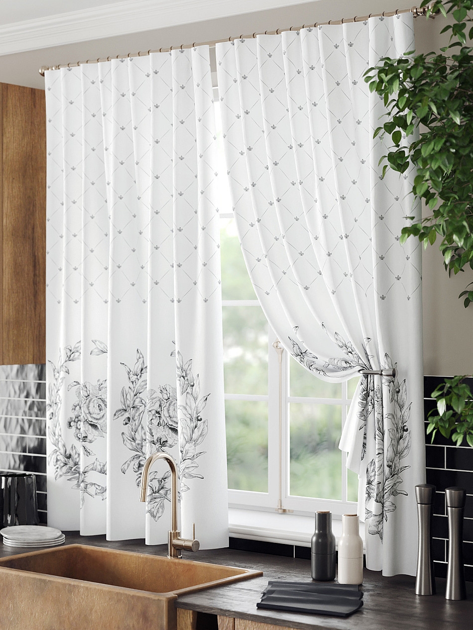 Комплект штор из легкой портьерной ткани (габардин) оформлен печатным рисунком. Печатный рисунок дает широкие возможности обновить интерьер фактически нет требуя ремонта за счет огромного выбора. Ткани с печатным рисунком безопасны и не содержат токсичных веществ. Не смотря на то что, материал легкий, он имеет высокую плотность, мало загрязнятся и не требует особого ухода даже после стирки, что важно для кухонных занавесок. Шторы не выцветают, не растягиваются, превосходно драпируются, образуя струящиеся складки. Прекрасное решение для создания красоты и уюта с помощью уникальных дизайнов.