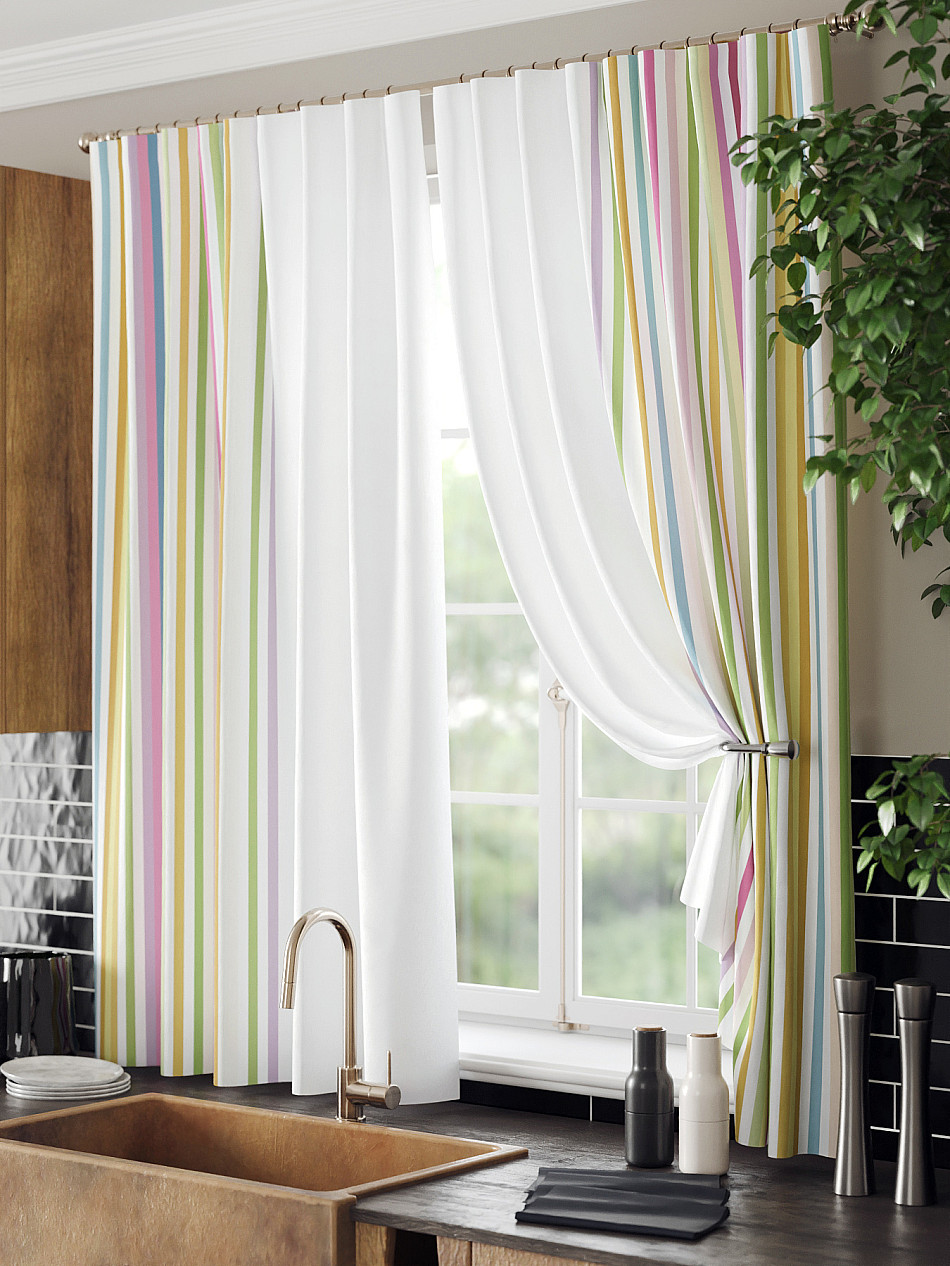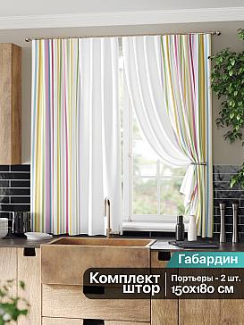 Комплект штор из легкой портьерной ткани (габардин) оформлен печатным рисунком. Печатный рисунок дает широкие возможности обновить интерьер фактически нет требуя ремонта за счет огромного выбора. Ткани с печатным рисунком безопасны и не содержат токсичных веществ. Не смотря на то что, материал легкий, он имеет высокую плотность, мало загрязнятся и не требует особого ухода даже после стирки, что важно для кухонных занавесок. Шторы не выцветают, не растягиваются, превосходно драпируются, образуя струящиеся складки. Прекрасное решение для создания красоты и уюта с помощью уникальных дизайнов.