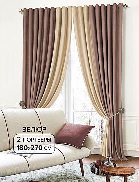 ВыбратьКомплект штор из мягкой ткани (Велюр) пудрово-бежевого цвета. Портьеры имеют стачной шов по вертикали, который после драпировки уходит в складку и становится невидимым. Велюр, приятный на ощупь, имеет ворсистую поверхность, прекрасно драпируется, образуя округлые складки. Ткань неприхотлива в уходе, возможна деликатная стирка.