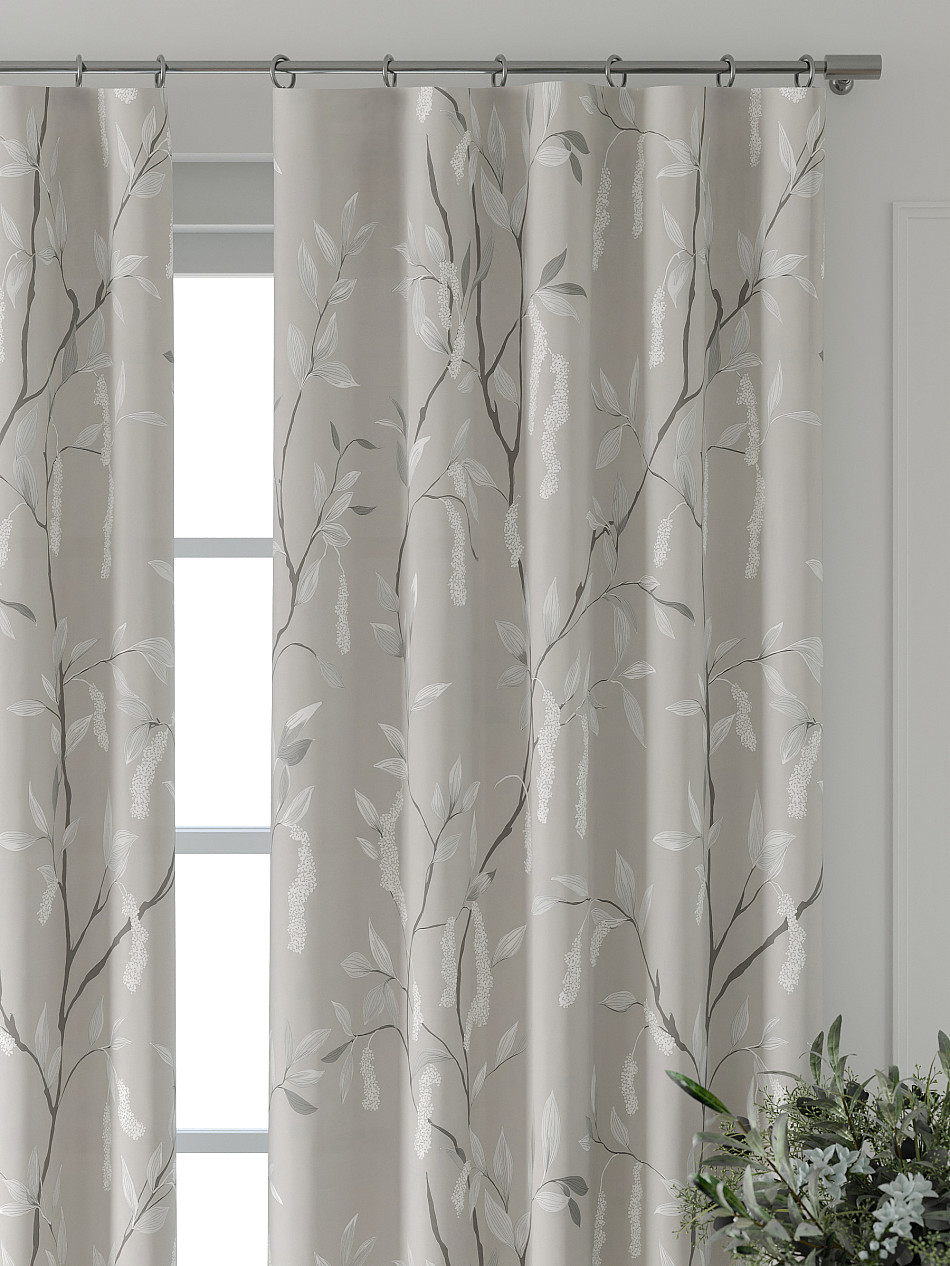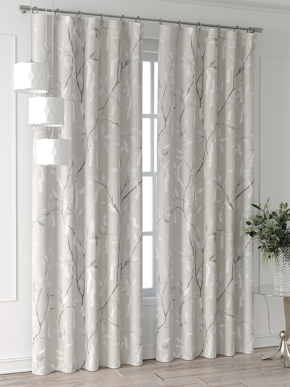 По верхнему краю портьер пришита шторная тесьма 6 см, с ее помощью затянув узелки от кордовых нитей с обеих сторон и стянув их до нужного размера можно сформировать округлые складки, далее вставить крючки в кармашки и повесить на карниз. Обязательно проверьте кордовые нити – они должны быть надежно завязаны, в противном случае во время стягивания они могут вылететь. Шторная тесьма имеет два ряда кармашков, с их помощью можно регулировать не только длину, но и ширину. Такое крепление подходит для всех типов карнизов.
