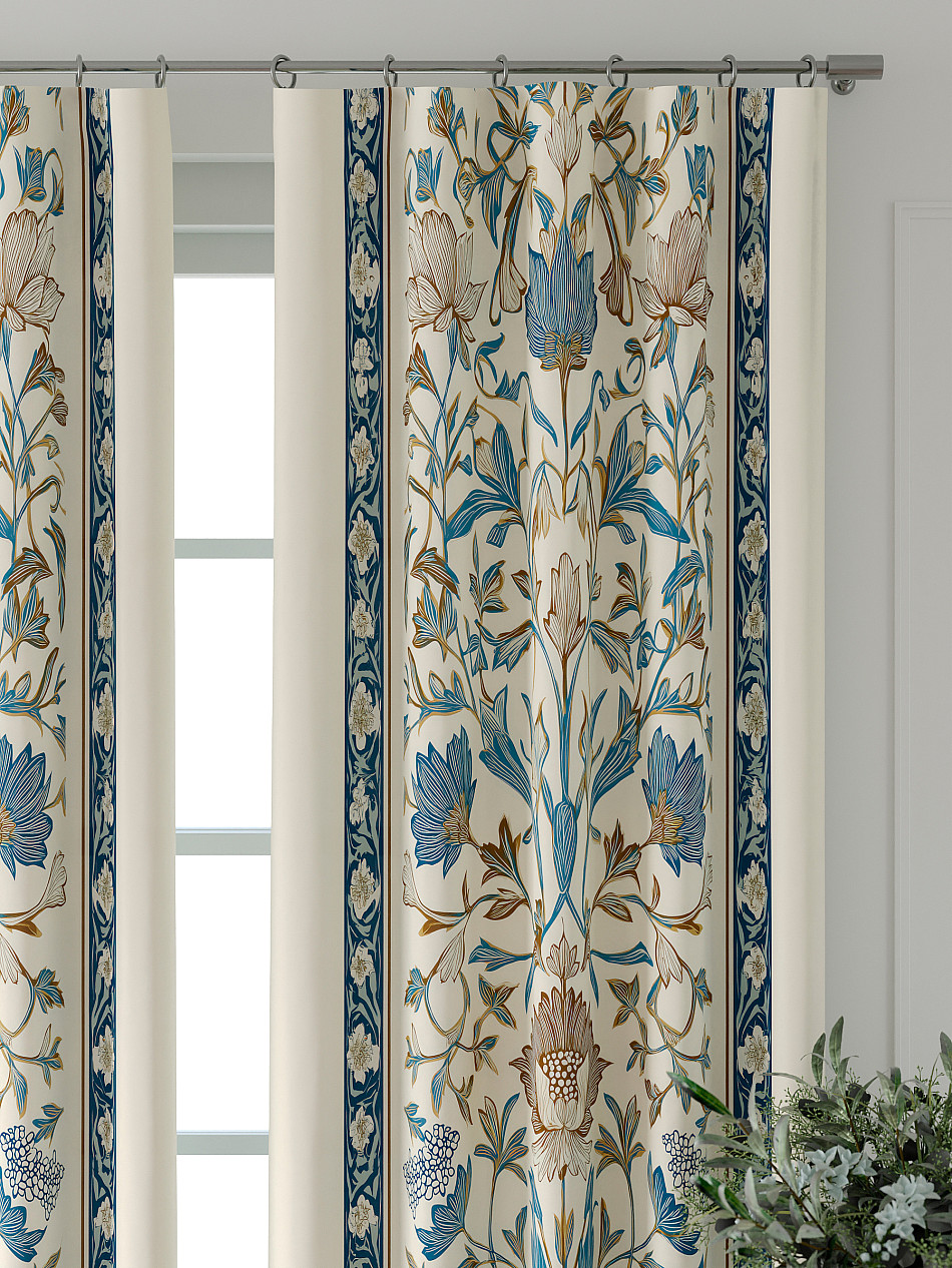 По верхнему краю портьеры пришита шторная тесьма 6 см, с ее помощью затянув узелки от кордовых нитей с обеих сторон и стянув их до нужного размера можно сформировать округлые складки, далее вставить крючки в кармашки и повесить на карниз. Обязательно проверьте кордовые нити – они должны быть надежно завязаны, в противном случае во время стягивания они могут вылететь. Шторная тесьма имеет два ряда кармашков, с их помощью можно регулировать не только длину, но и ширину. Такое крепление подходит для всех типов карнизов.