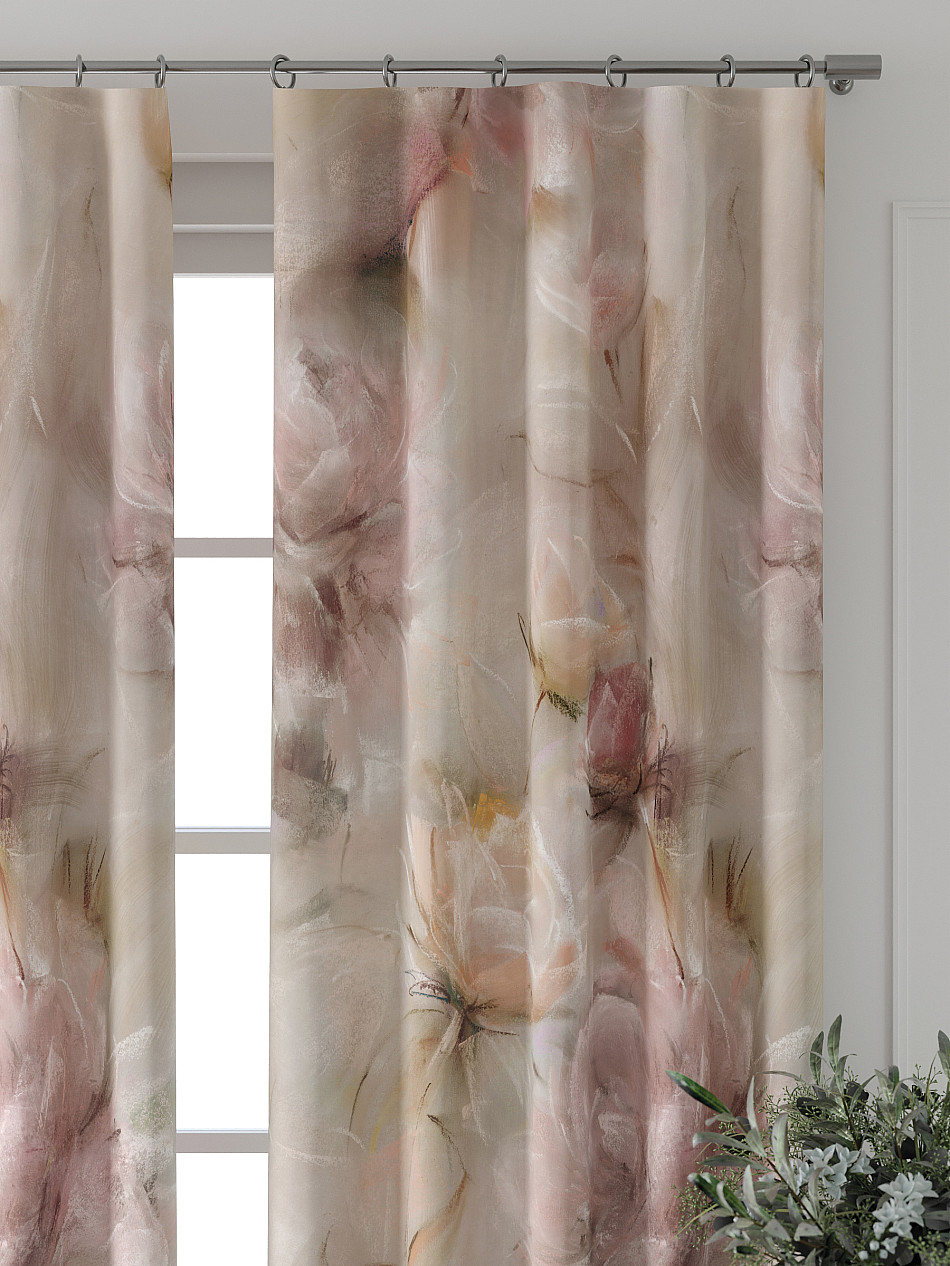 По верхнему краю портьер пришита шторная тесьма 6 см, с ее помощью затянув узелки от кордовых нитей с обеих сторон и стянув их до нужного размера можно сформировать округлые складки, далее вставить крючки в кармашки и повесить на карниз. Обязательно проверьте кордовые нити – они должны быть надежно завязаны, в противном случае во время стягивания они могут вылететь. Шторная тесьма имеет два ряда кармашков, с их помощью можно регулировать не только длину, но и ширину. Такое крепление подходит для всех типов карнизов.
