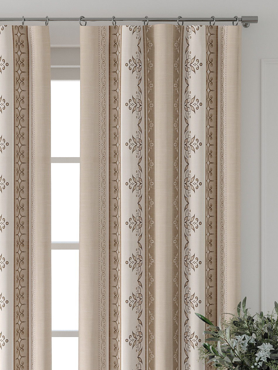 По верхнему краю портьер пришита шторная тесьма 6 см, с ее помощью затянув узелки от кордовых нитей с обеих сторон и стянув их до нужного размера можно сформировать округлые складки, далее вставить крючки в кармашки и повесить на карниз. Обязательно проверьте кордовые нити – они должны быть надежно завязаны, в противном случае во время стягивания они могут вылететь. Шторная тесьма имеет два ряда кармашков, с их помощью можно регулировать не только длину, но и ширину. Такое крепление подходит для всех типов карнизов.