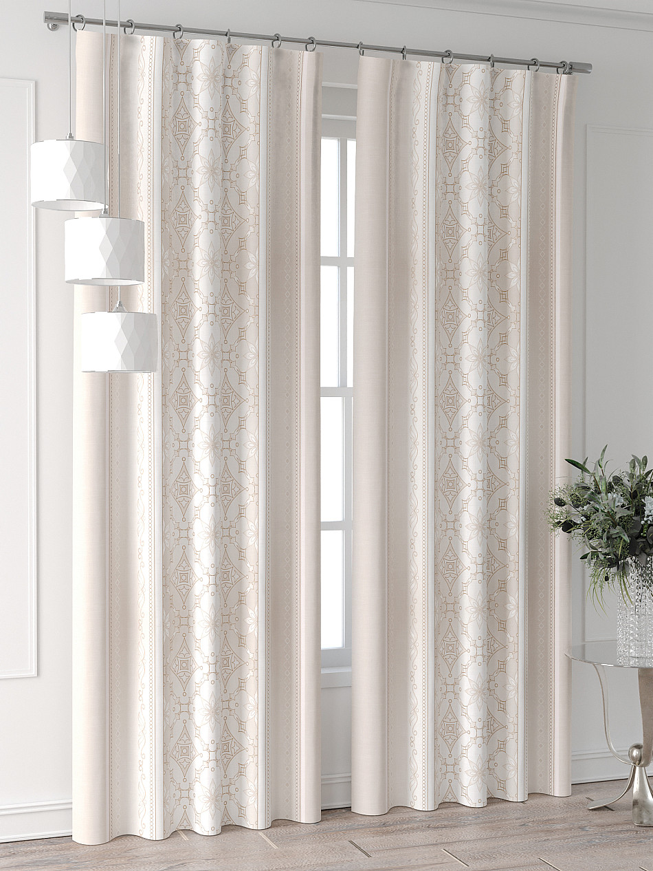По верхнему краю портьер пришита шторная тесьма 6 см, с ее помощью затянув узелки от кордовых нитей с обеих сторон и стянув их до нужного размера можно сформировать округлые складки, далее вставить крючки в кармашки и повесить на карниз. Обязательно проверьте кордовые нити – они должны быть надежно завязаны, в противном случае во время стягивания они могут вылететь. Шторная тесьма имеет два ряда кармашков, с их помощью можно регулировать не только длину, но и ширину. Такое крепление подходит для всех типов карнизов.