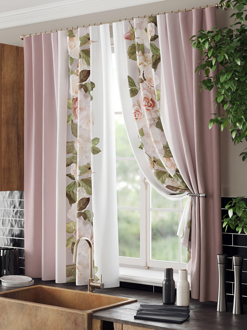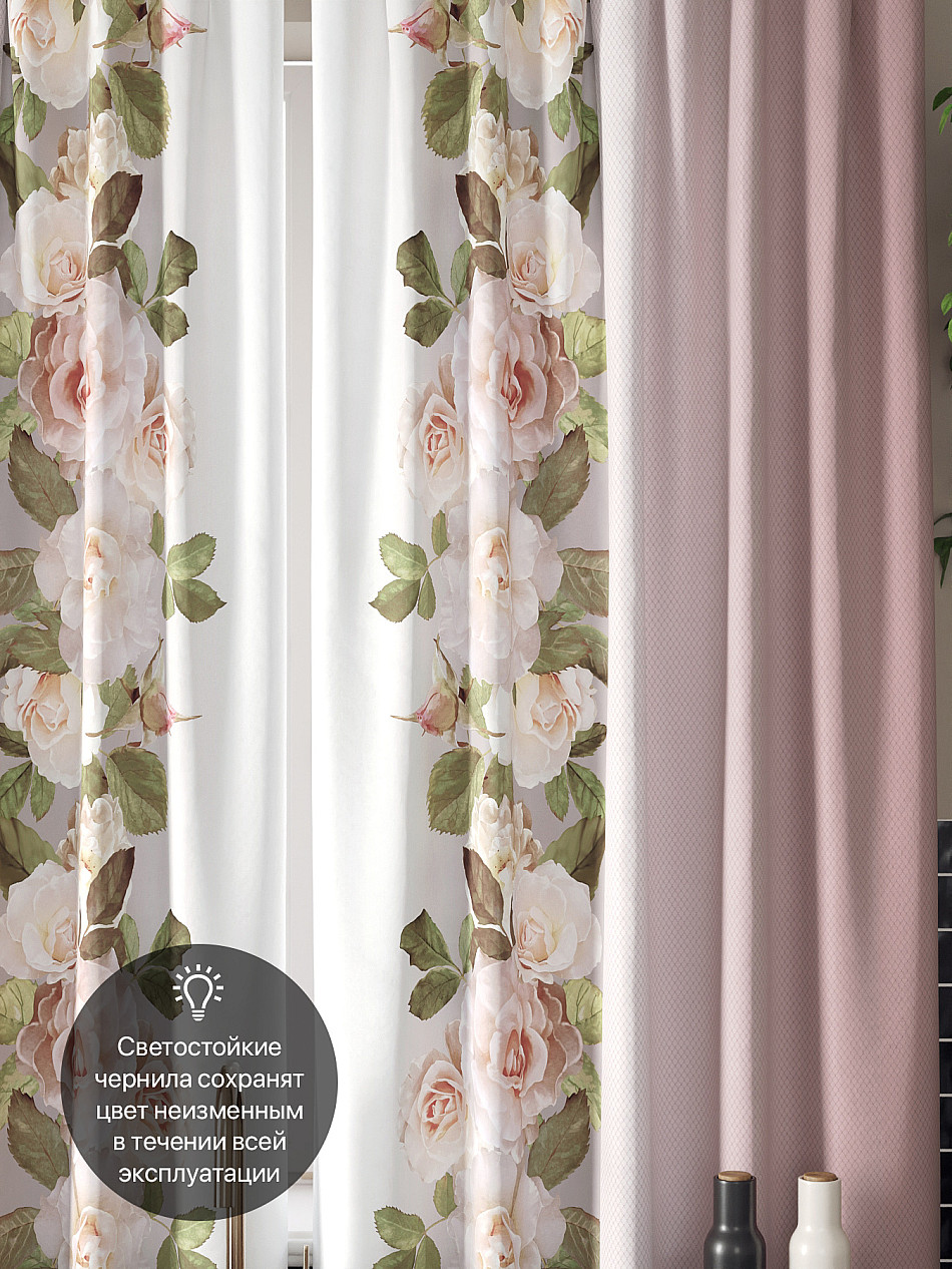 Комплект штор из легкой портьерной ткани (габардин) оформлен печатным рисунком. Печатный рисунок дает широкие возможности обновить интерьер фактически нет требуя ремонта за счет огромного выбора. Ткани с печатным рисунком безопасны и не содержат токсичных веществ. Не смотря на то что, материал легкий, он имеет высокую плотность, мало загрязнятся и не требует особого ухода даже после стирки, что важно для кухонных занавесок. Шторы не выцветают, не растягиваются, превосходно драпируются, образуя струящиеся складки. Прекрасное решение для создания красоты и уюта с помощью уникальных дизайнов.