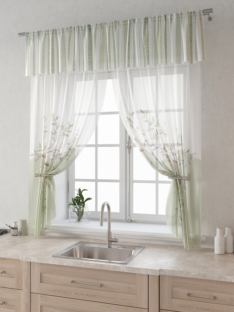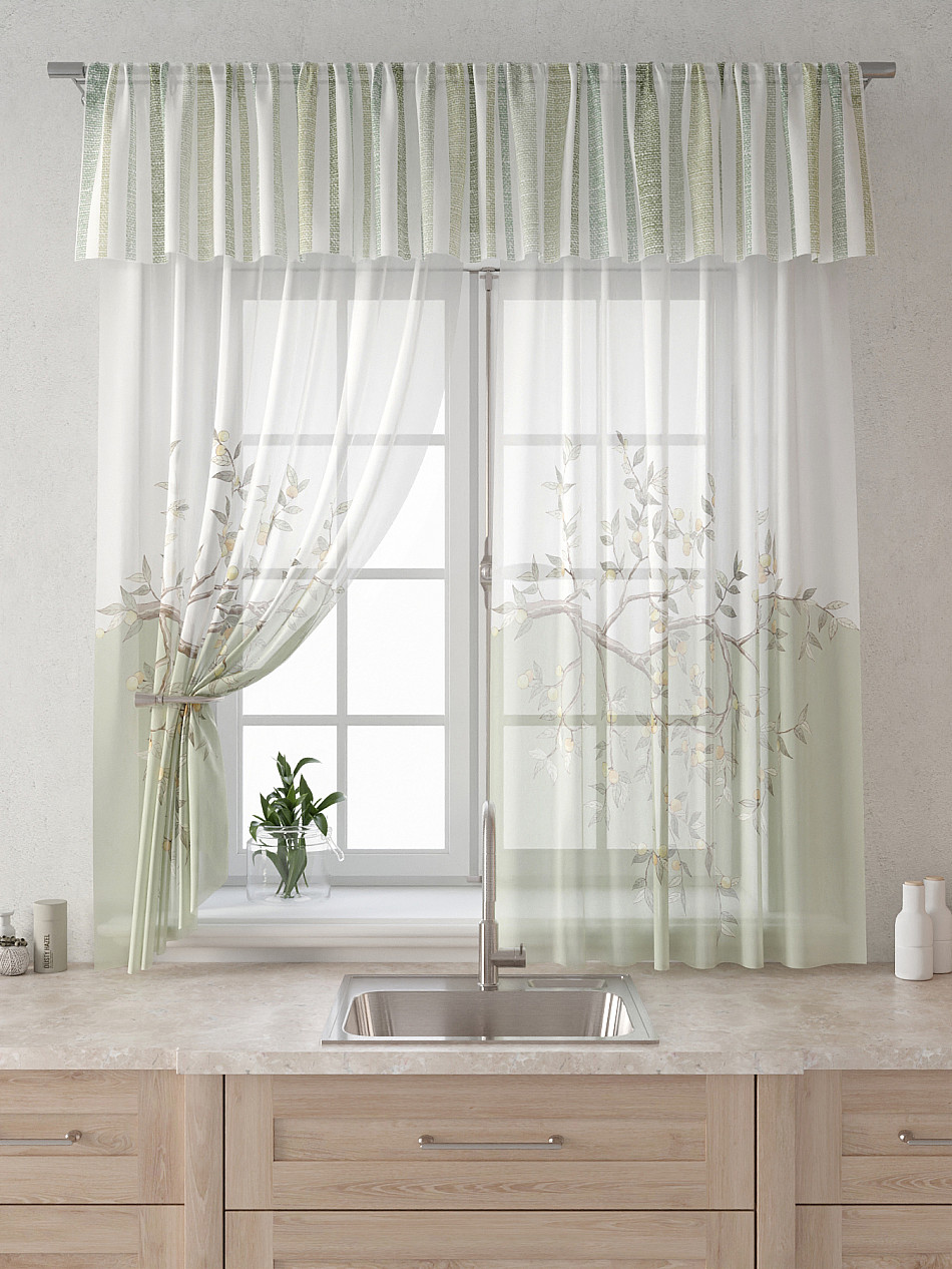 Вуаль 150х160 см. — 2 шт., Ламбрекен 300х40 см. — 1 шт. Комплект штор из вуали оформлены печатным рисунком. Печатный рисунок дает широкие возможности обновить интерьер фактически не требуя ремонта за счет огромного выбора. Ткани с печатным рисунком безопасны и не содержат токсичных веществ. Не смотря на то, что материал легкий, он имеет высокую плотность, мало загрязнятся и не требует особого ухода даже после стирки, что важно для кухонных занавесок. Тюль не выцветает, не растягивается, превосходно драпируются, образуя струящиеся складки. Прекрасное решение для создания красоты и уюта с помощью уникальных дизайнов.