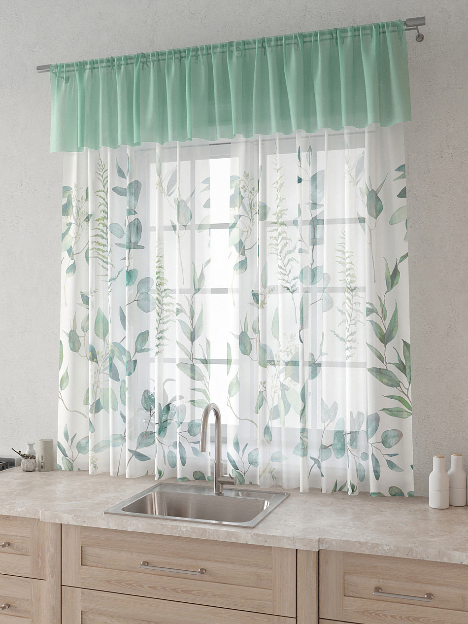 Вуаль 150х160 см. — 2 шт., Ламбрекен 300х40 см. — 1 шт. Комплект штор из вуали оформлены печатным рисунком. Печатный рисунок дает широкие возможности обновить интерьер фактически не требуя ремонта за счет огромного выбора. Ткани с печатным рисунком безопасны и не содержат токсичных веществ. Не смотря на то, что материал легкий, он имеет высокую плотность, мало загрязнятся и не требует особого ухода даже после стирки, что важно для кухонных занавесок. Тюль не выцветает, не растягивается, превосходно драпируются, образуя струящиеся складки. Прекрасное решение для создания красоты и уюта с помощью уникальных дизайнов.