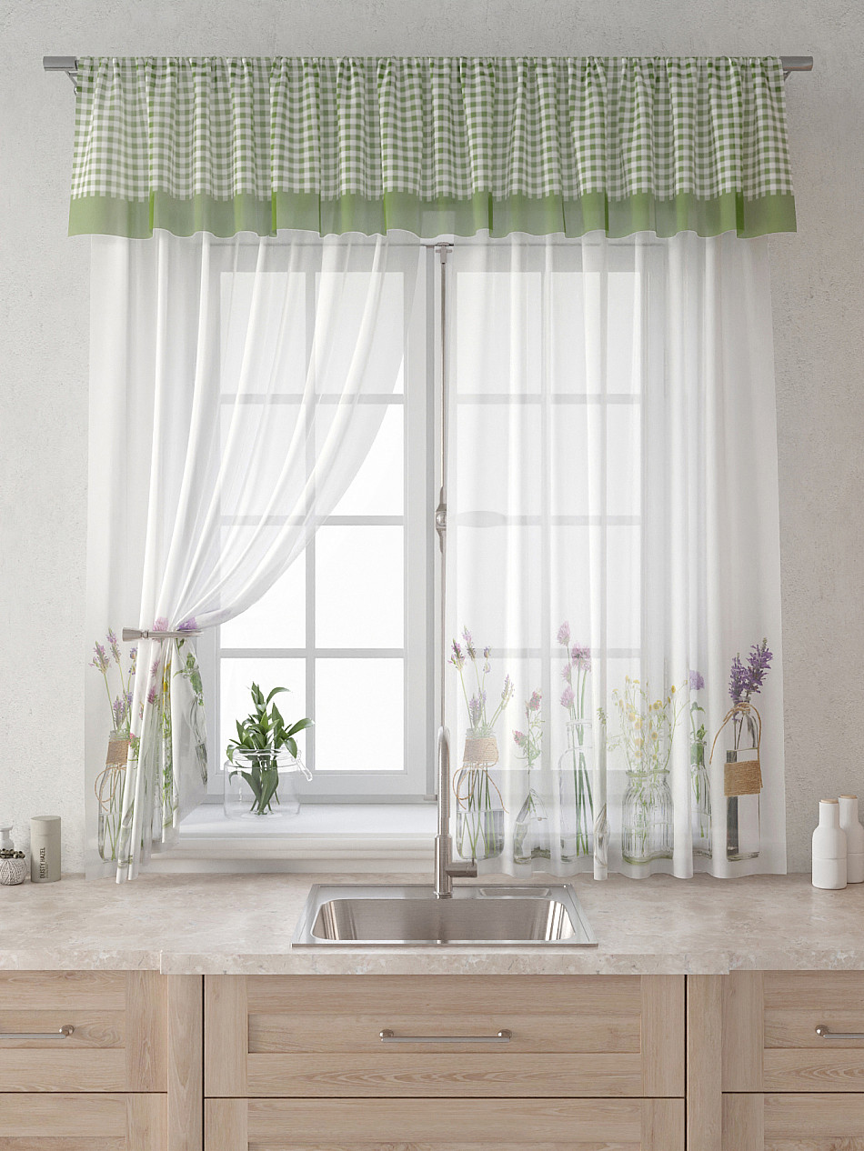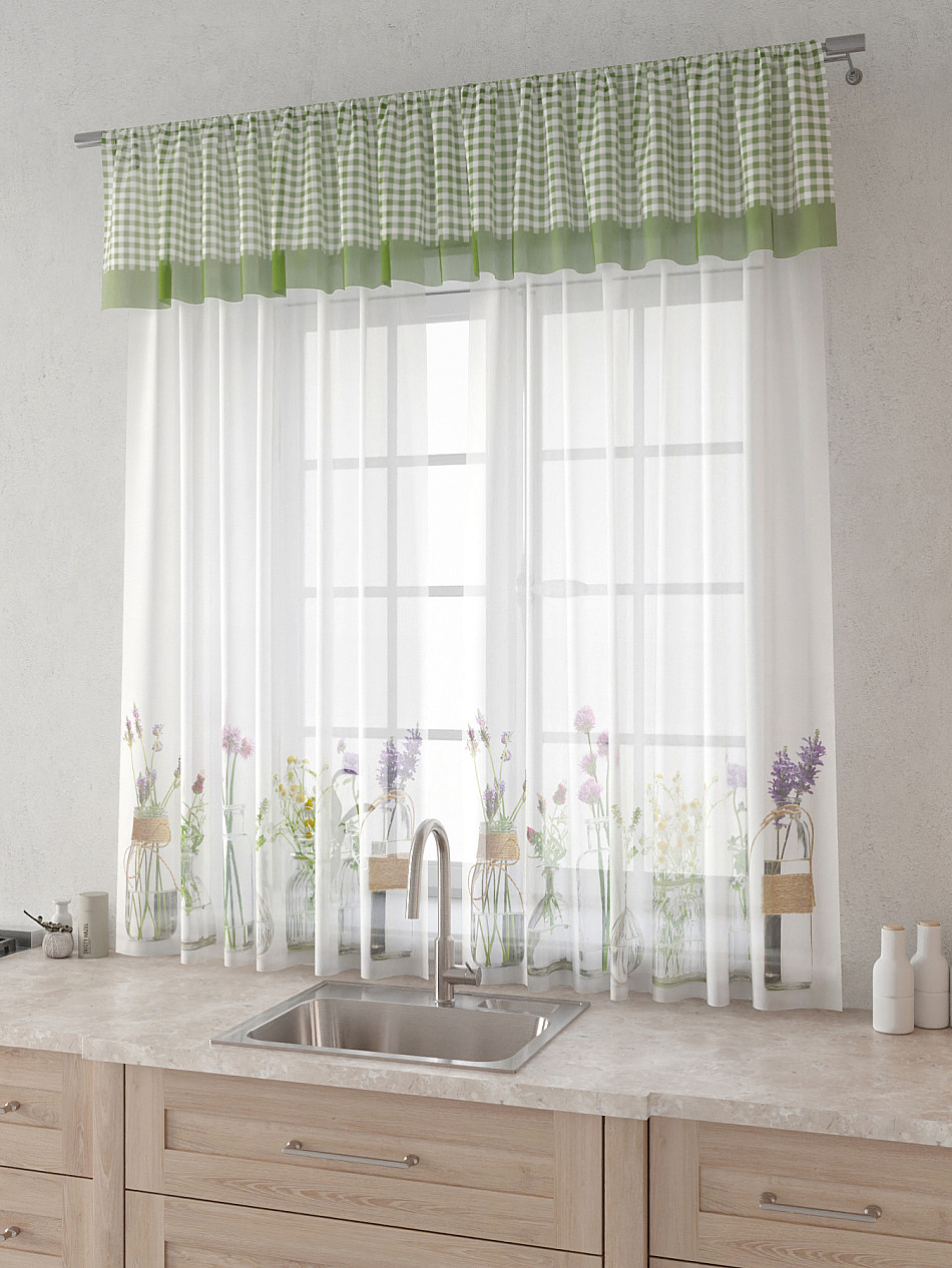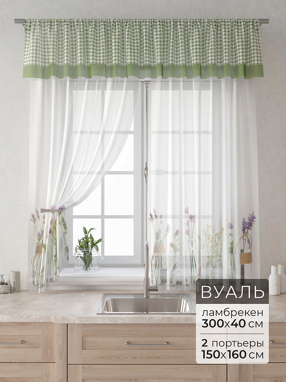 Вуаль 150х160 см. — 2 шт., Ламбрекен 300х40 см. — 1 шт. Комплект штор из вуали оформлены печатным рисунком. Печатный рисунок дает широкие возможности обновить интерьер фактически не требуя ремонта за счет огромного выбора. Ткани с печатным рисунком безопасны и не содержат токсичных веществ. Не смотря на то, что материал легкий, он имеет высокую плотность, мало загрязнятся и не требует особого ухода даже после стирки, что важно для кухонных занавесок. Тюль не выцветает, не растягивается, превосходно драпируются, образуя струящиеся складки. Прекрасное решение для создания красоты и уюта с помощью уникальных дизайнов.