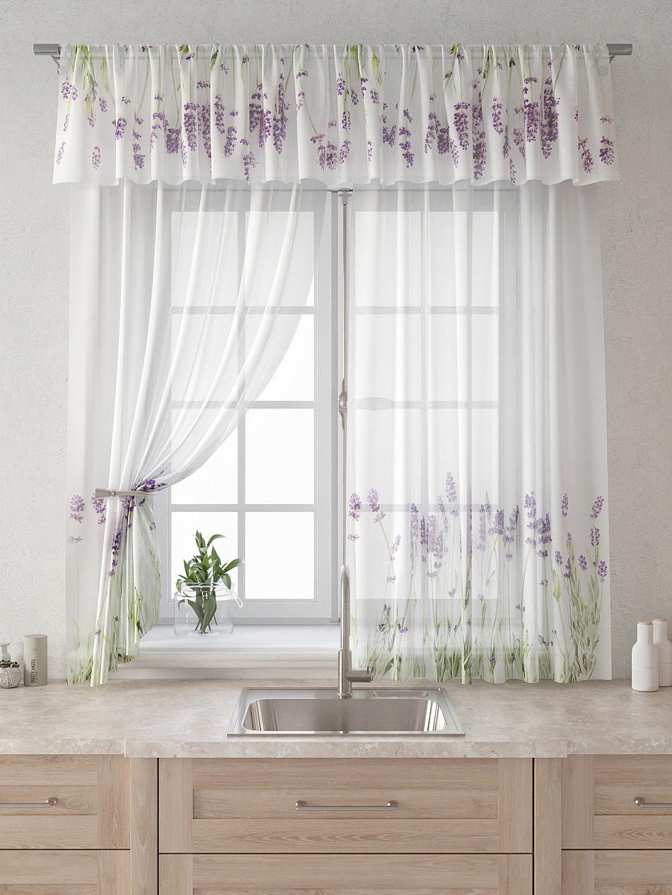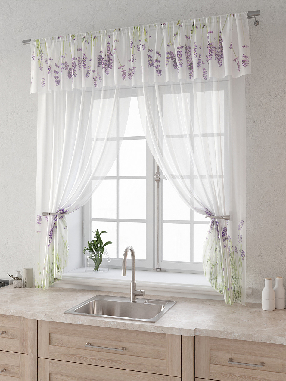 Вуаль 150х160 см. — 2 шт., Ламбрекен 300х40 см. — 1 шт. Комплект штор из вуали оформлены печатным рисунком. Печатный рисунок дает широкие возможности обновить интерьер фактически не требуя ремонта за счет огромного выбора. Ткани с печатным рисунком безопасны и не содержат токсичных веществ. Не смотря на то, что материал легкий, он имеет высокую плотность, мало загрязнятся и не требует особого ухода даже после стирки, что важно для кухонных занавесок. Тюль не выцветает, не растягивается, превосходно драпируются, образуя струящиеся складки. Прекрасное решение для создания красоты и уюта с помощью уникальных дизайнов.