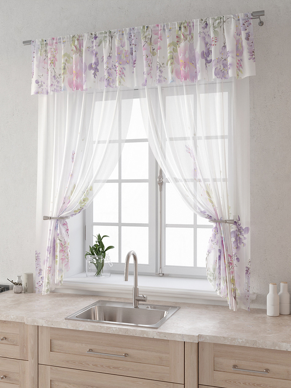 Вуаль 150х160 см. — 2 шт., Ламбрекен 300х40 см. — 1 шт. Комплект штор из вуали оформлены печатным рисунком. Печатный рисунок дает широкие возможности обновить интерьер фактически не требуя ремонта за счет огромного выбора. Ткани с печатным рисунком безопасны и не содержат токсичных веществ. Не смотря на то, что материал легкий, он имеет высокую плотность, мало загрязнятся и не требует особого ухода даже после стирки, что важно для кухонных занавесок. Тюль не выцветает, не растягивается, превосходно драпируются, образуя струящиеся складки. Прекрасное решение для создания красоты и уюта с помощью уникальных дизайнов.