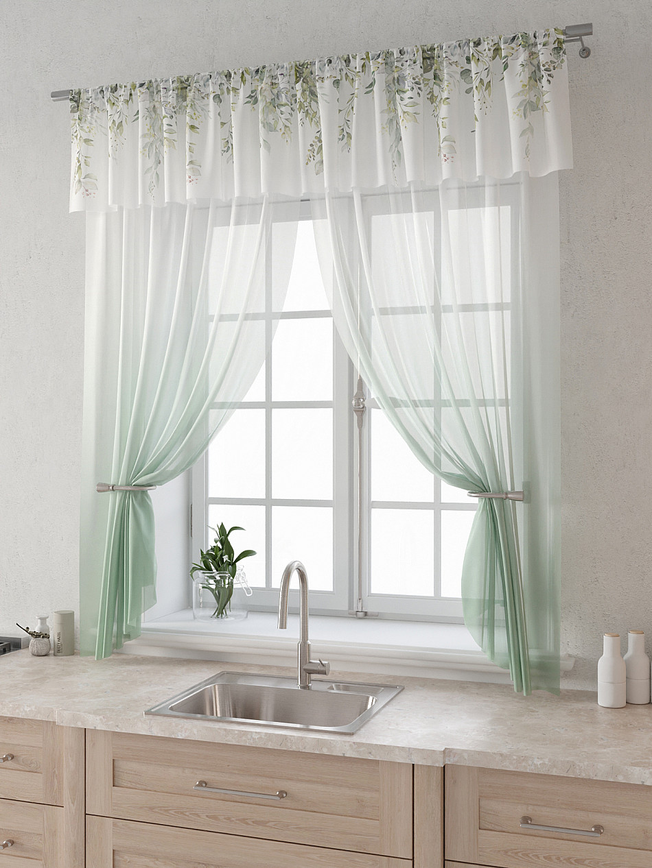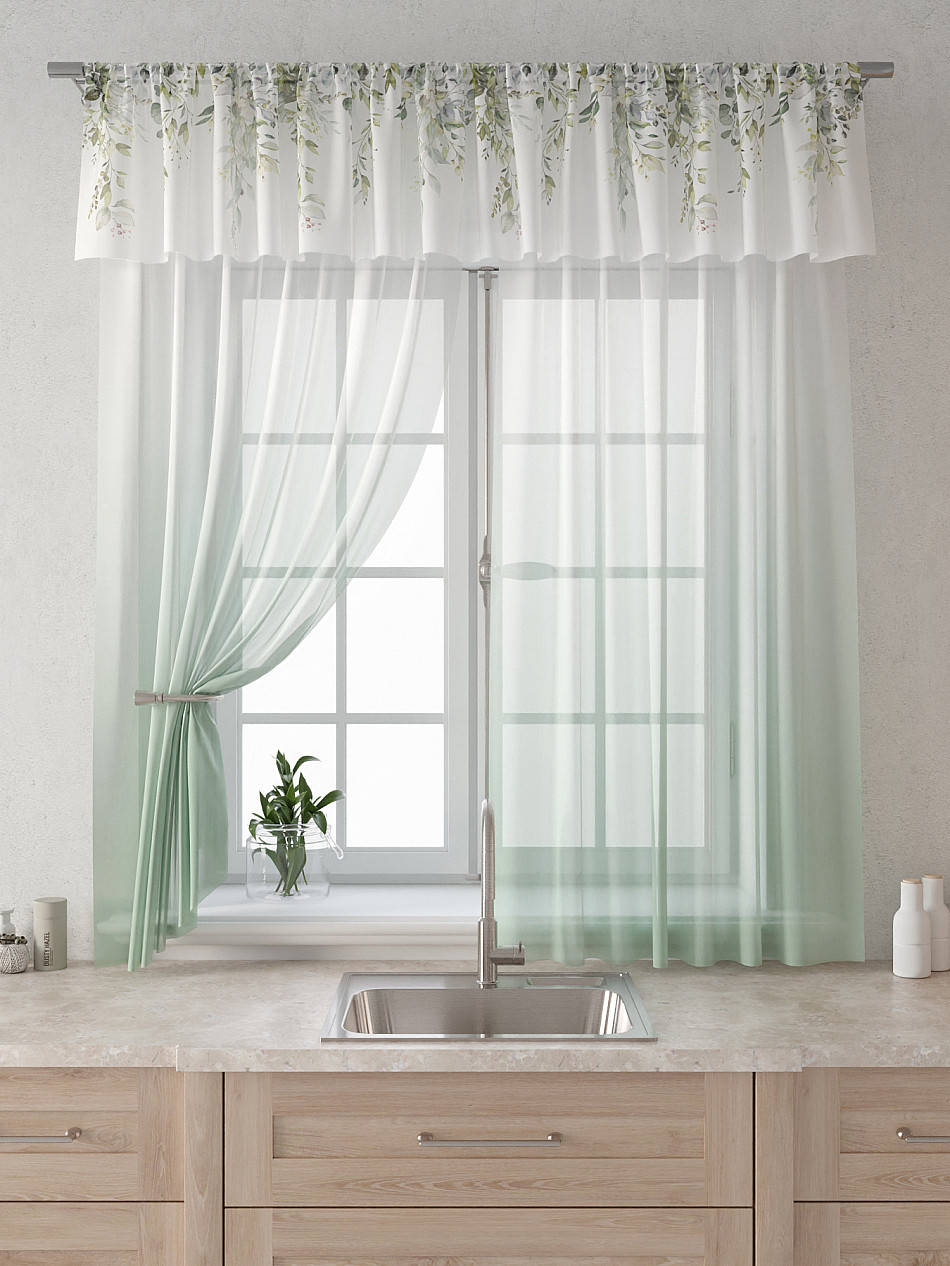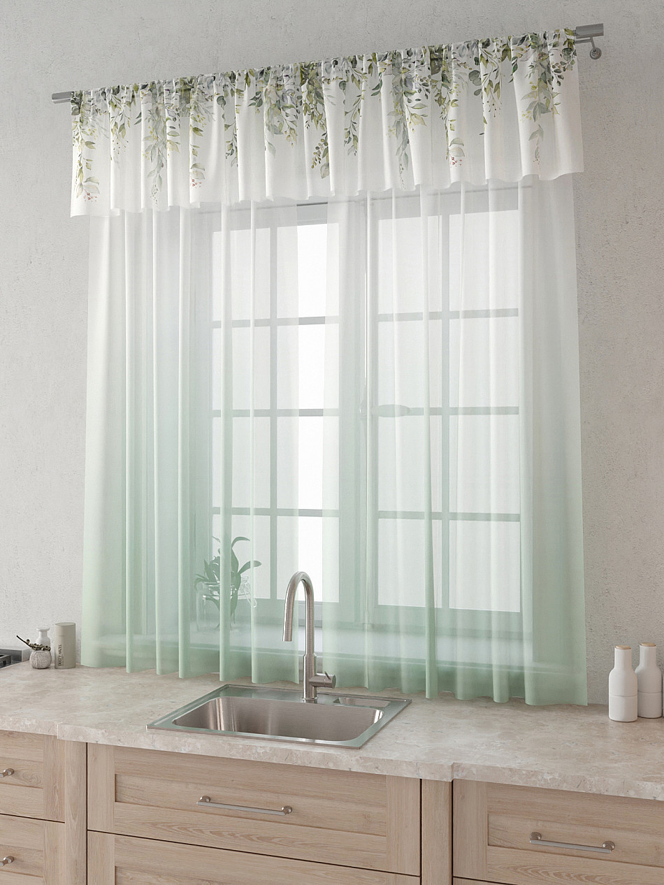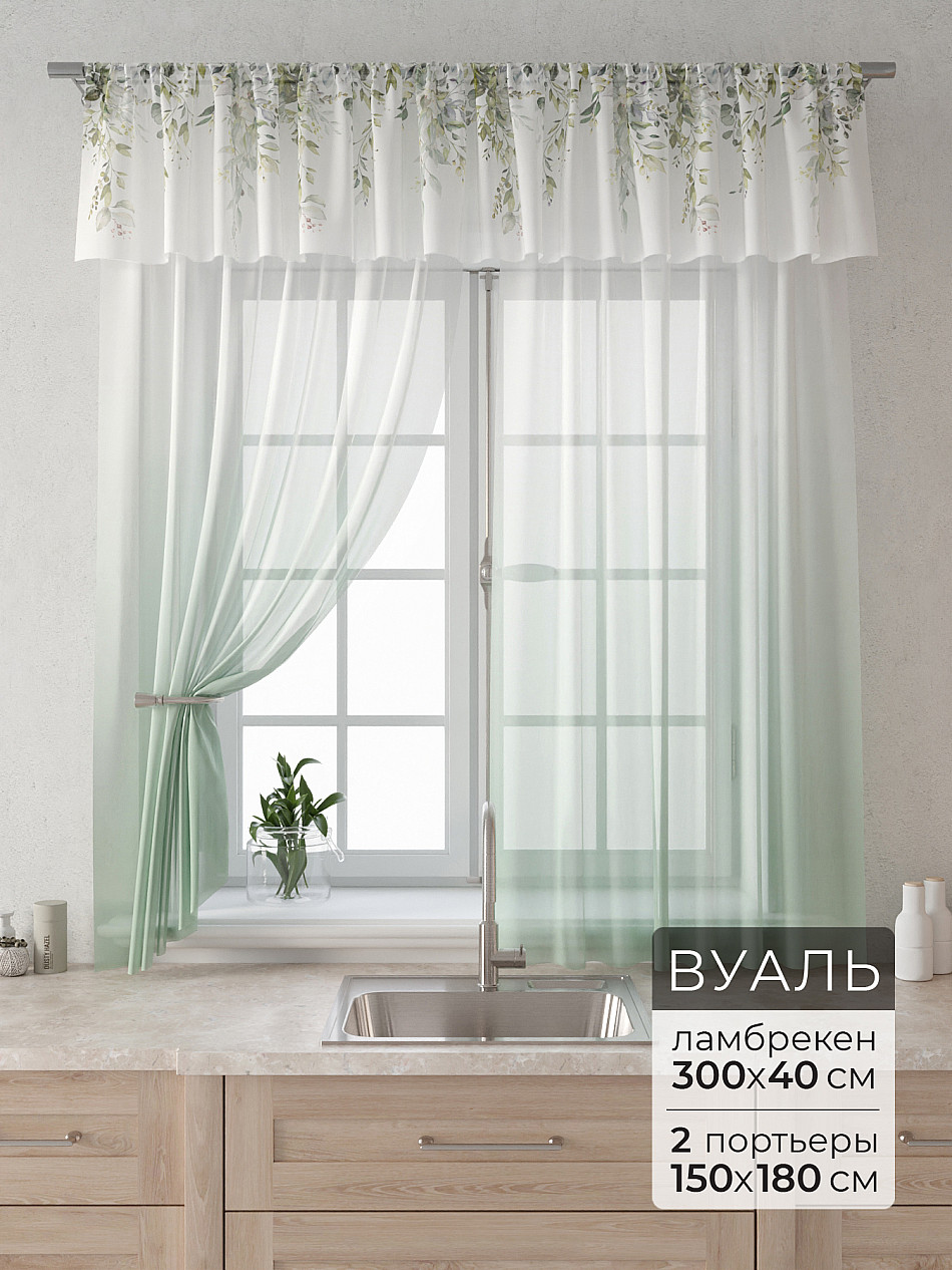 Вуаль 150х180 см. — 2 шт., Ламбрекен 300х40 см. — 1 шт. Комплект штор из вуали оформлены печатным рисунком. Печатный рисунок дает широкие возможности обновить интерьер фактически не требуя ремонта за счет огромного выбора. Ткани с печатным рисунком безопасны и не содержат токсичных веществ. Не смотря на то, что материал легкий, он имеет высокую плотность, мало загрязнятся и не требует особого ухода даже после стирки, что важно для кухонных занавесок. Тюль не выцветает, не растягивается, превосходно драпируются, образуя струящиеся складки. Прекрасное решение для создания красоты и уюта с помощью уникальных дизайнов.