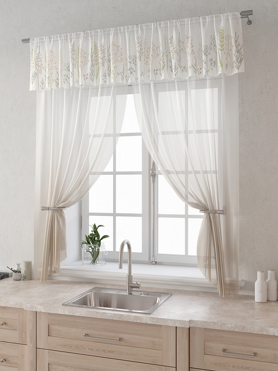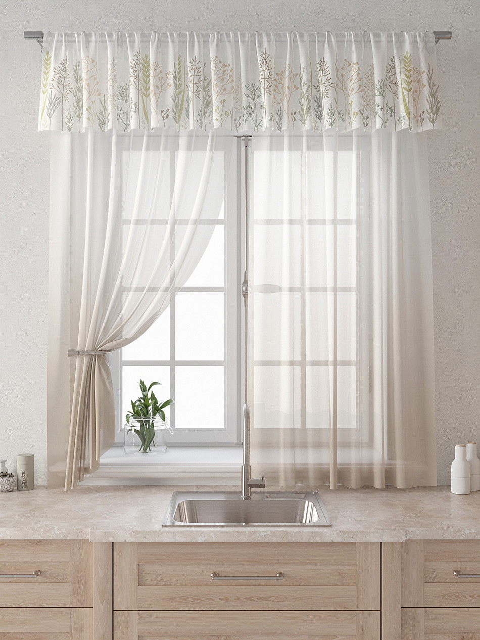 Вуаль 150х160 см. — 2 шт., Ламбрекен 300х40 см. — 1 шт. Комплект штор из вуали оформлены печатным рисунком. Печатный рисунок дает широкие возможности обновить интерьер фактически не требуя ремонта за счет огромного выбора. Ткани с печатным рисунком безопасны и не содержат токсичных веществ. Не смотря на то, что материал легкий, он имеет высокую плотность, мало загрязнятся и не требует особого ухода даже после стирки, что важно для кухонных занавесок. Тюль не выцветает, не растягивается, превосходно драпируются, образуя струящиеся складки. Прекрасное решение для создания красоты и уюта с помощью уникальных дизайнов.