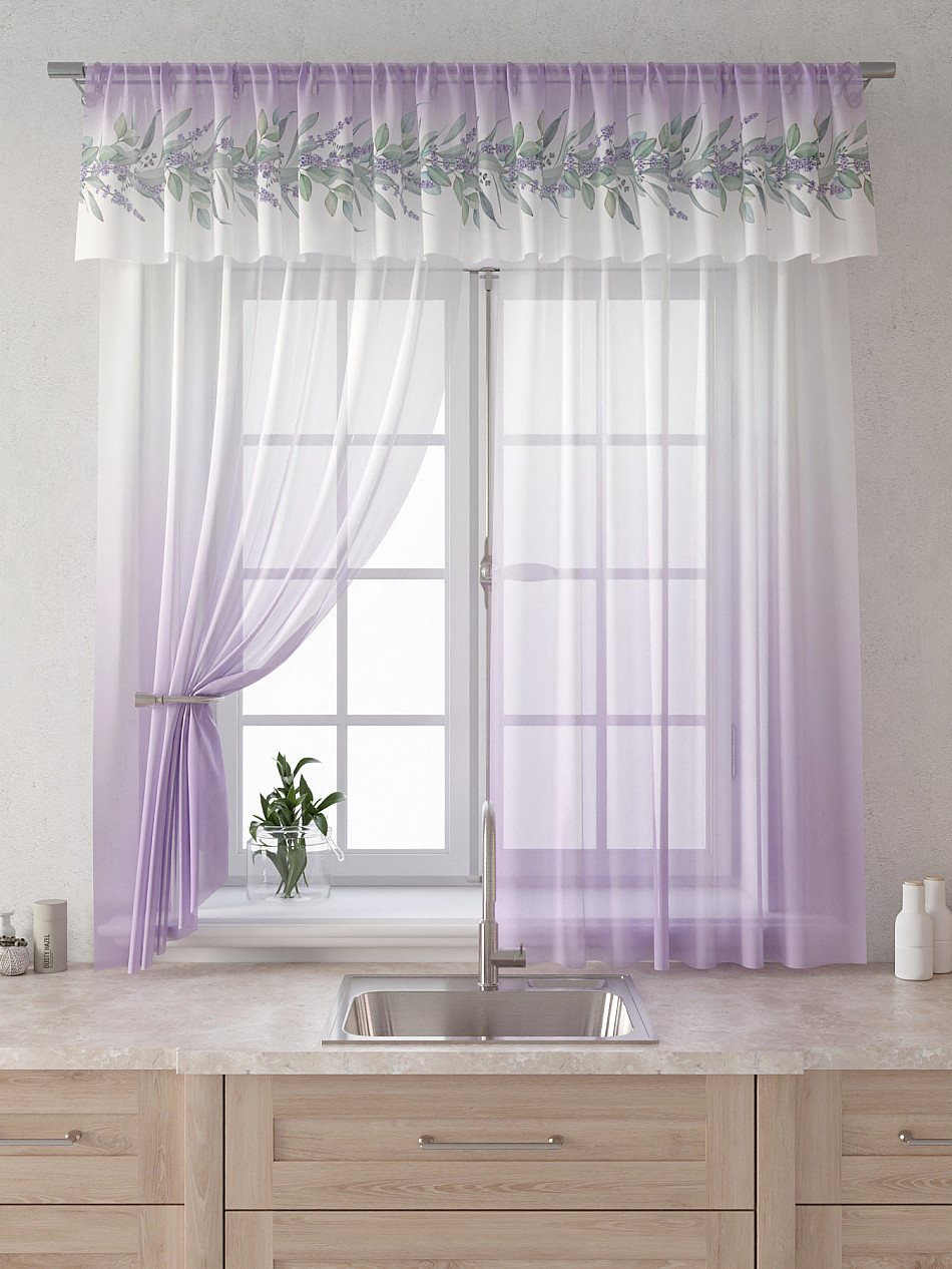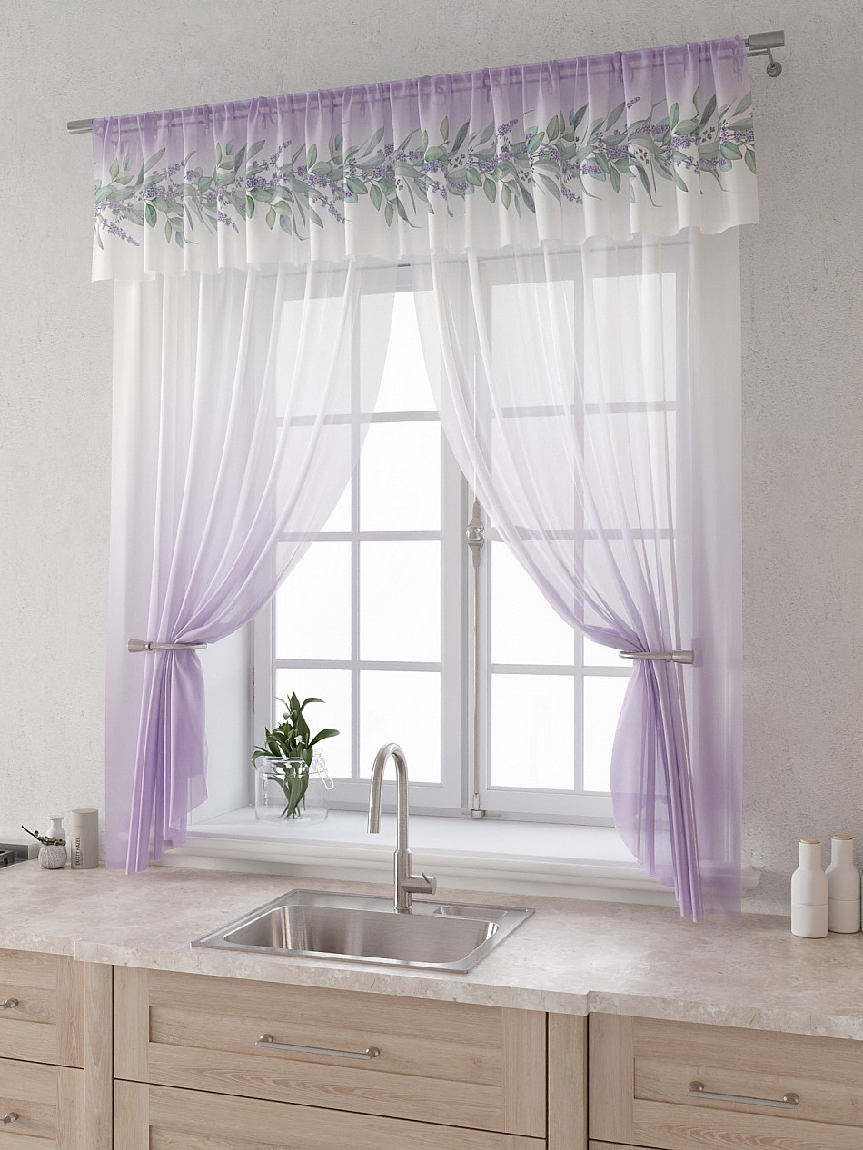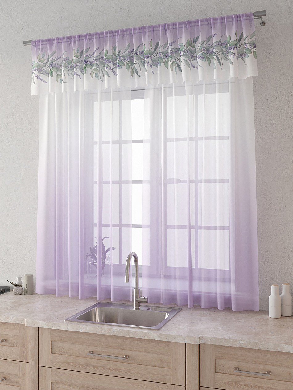 Вуаль 150х180 см. — 2 шт., Ламбрекен 300х40 см. — 1 шт. Комплект штор из вуали оформлены печатным рисунком. Печатный рисунок дает широкие возможности обновить интерьер фактически не требуя ремонта за счет огромного выбора. Ткани с печатным рисунком безопасны и не содержат токсичных веществ. Не смотря на то, что материал легкий, он имеет высокую плотность, мало загрязнятся и не требует особого ухода даже после стирки, что важно для кухонных занавесок. Тюль не выцветает, не растягивается, превосходно драпируются, образуя струящиеся складки. Прекрасное решение для создания красоты и уюта с помощью уникальных дизайнов.