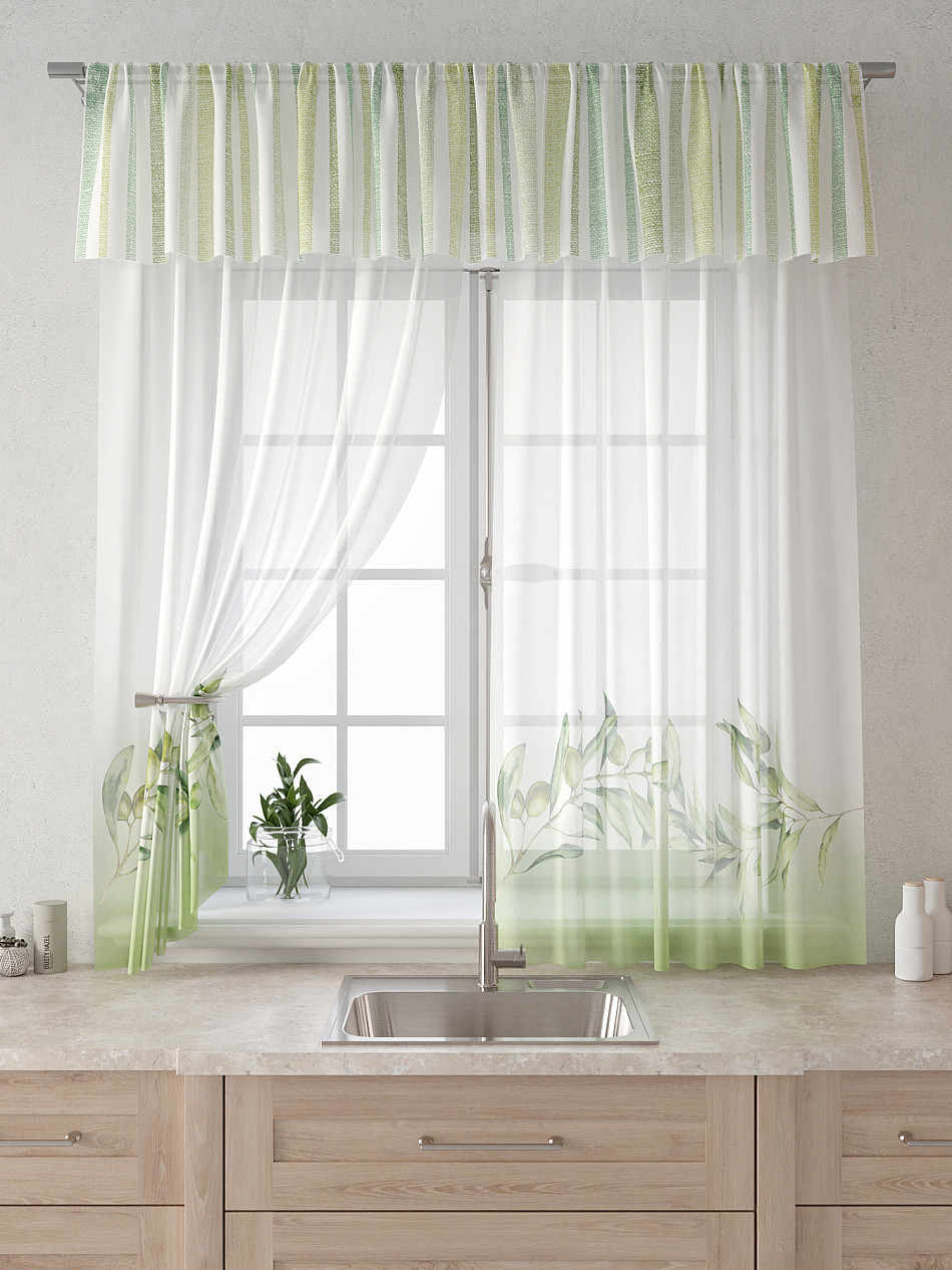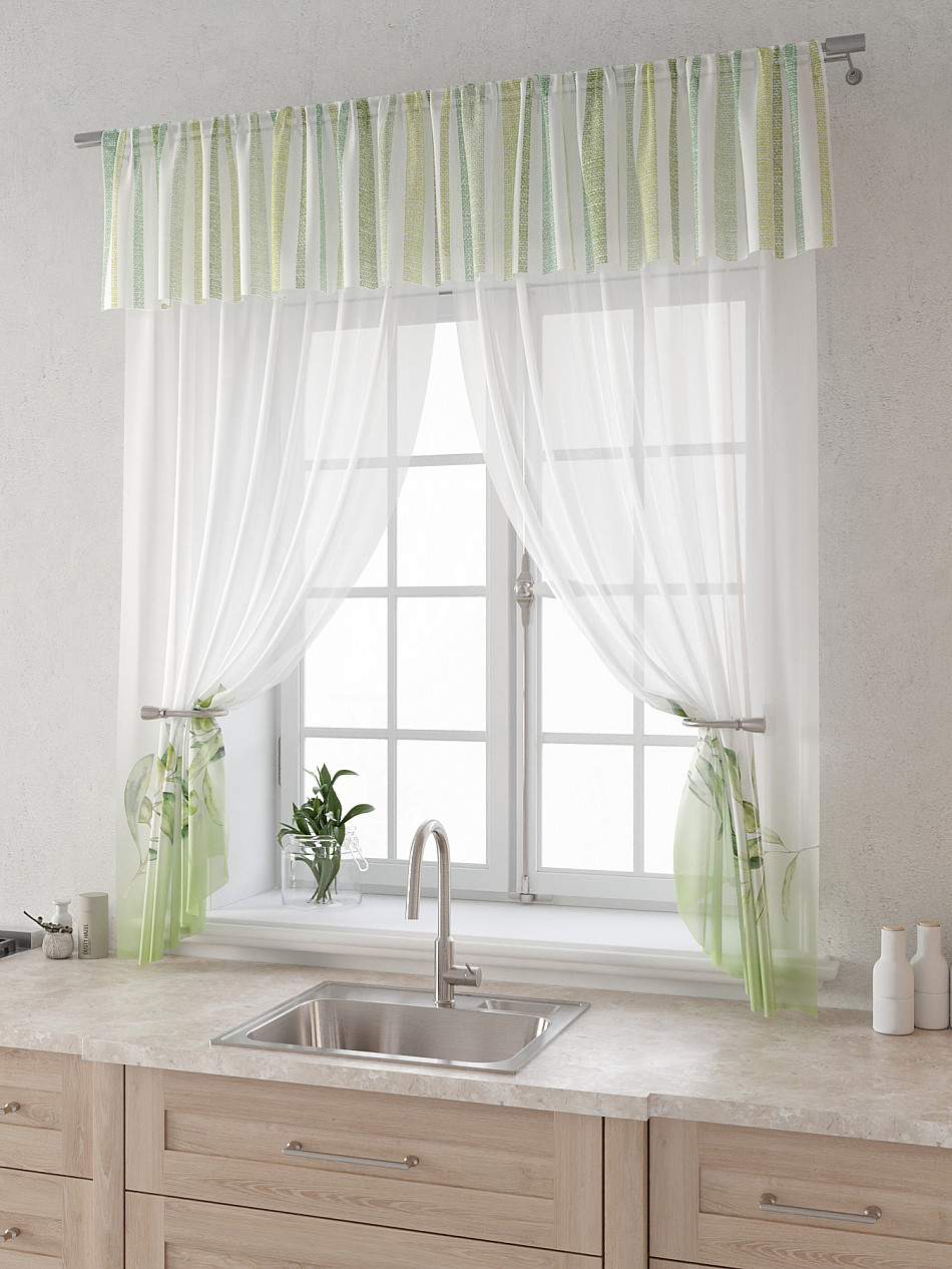 Вуаль 150х160 см. — 2 шт., Ламбрекен 300х40 см. — 1 шт. Комплект штор из вуали оформлены печатным рисунком. Печатный рисунок дает широкие возможности обновить интерьер фактически не требуя ремонта за счет огромного выбора. Ткани с печатным рисунком безопасны и не содержат токсичных веществ. Не смотря на то, что материал легкий, он имеет высокую плотность, мало загрязнятся и не требует особого ухода даже после стирки, что важно для кухонных занавесок. Тюль не выцветает, не растягивается, превосходно драпируются, образуя струящиеся складки. Прекрасное решение для создания красоты и уюта с помощью уникальных дизайнов.