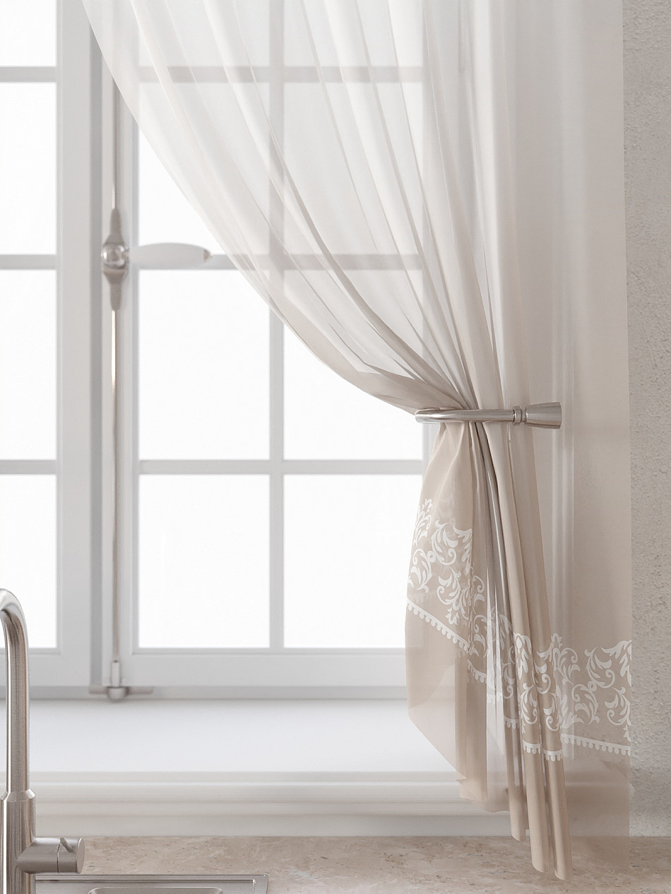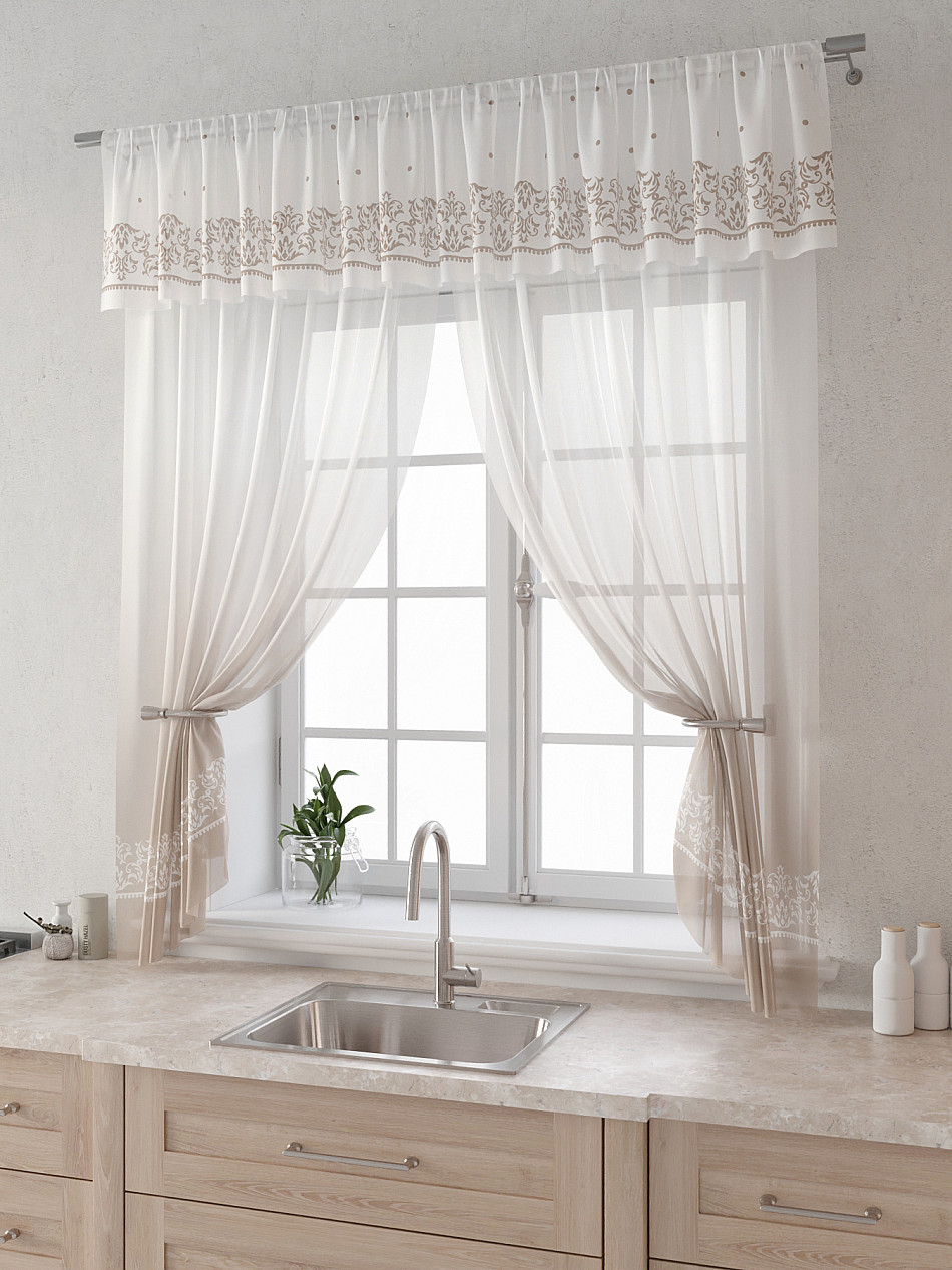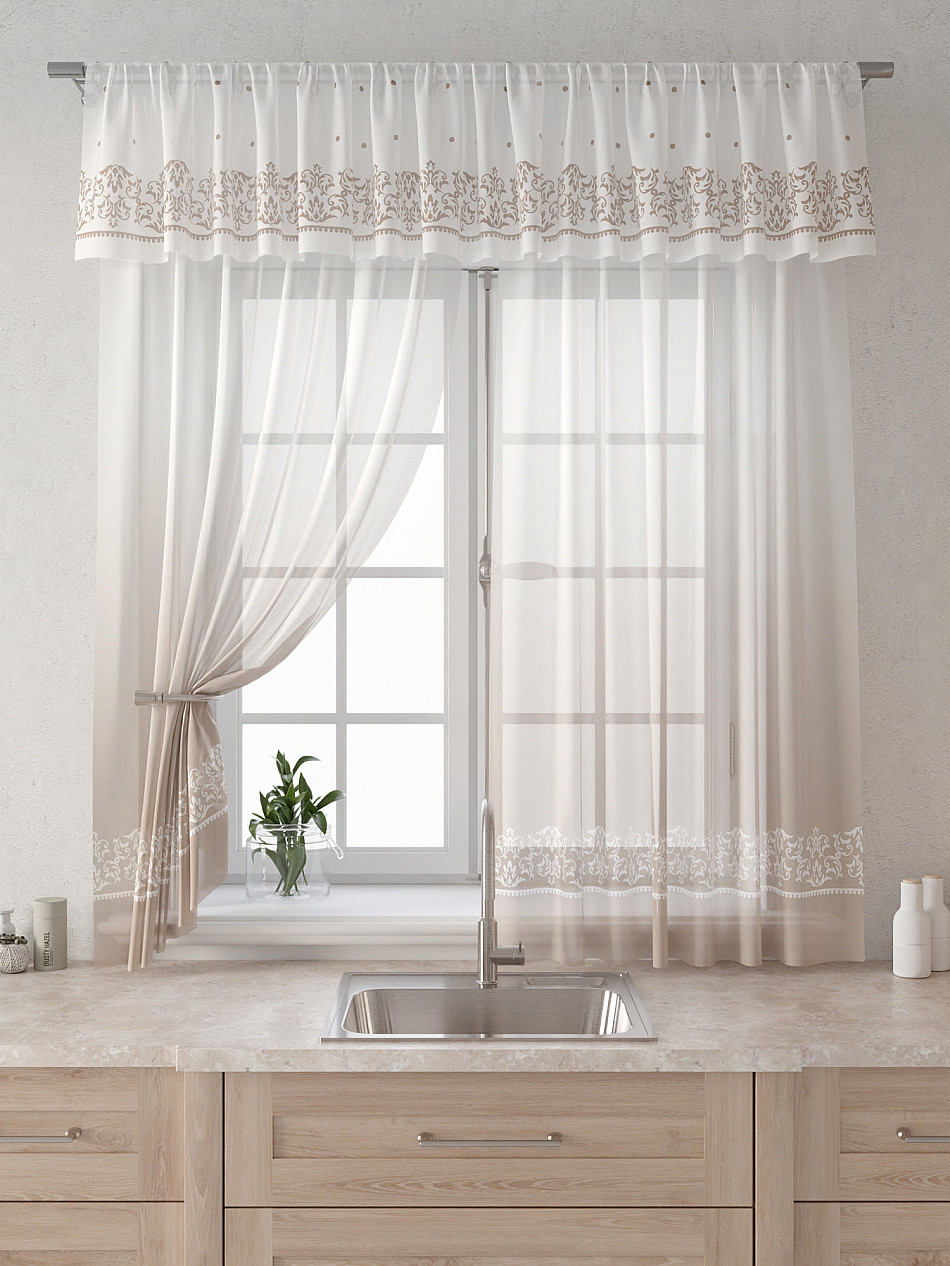 Вуаль 150х160 см. — 2 шт., Ламбрекен 300х40 см. — 1 шт. Комплект штор из вуали оформлены печатным рисунком. Печатный рисунок дает широкие возможности обновить интерьер фактически не требуя ремонта за счет огромного выбора. Ткани с печатным рисунком безопасны и не содержат токсичных веществ. Не смотря на то, что материал легкий, он имеет высокую плотность, мало загрязнятся и не требует особого ухода даже после стирки, что важно для кухонных занавесок. Тюль не выцветает, не растягивается, превосходно драпируются, образуя струящиеся складки. Прекрасное решение для создания красоты и уюта с помощью уникальных дизайнов.