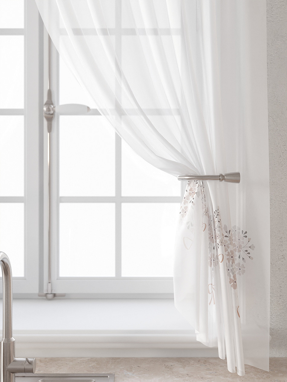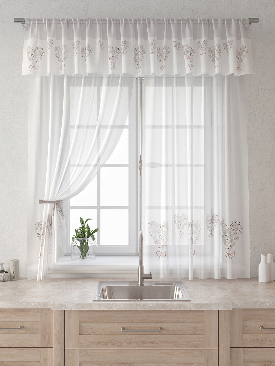 Вуаль 150х180 см. — 2 шт., Ламбрекен 300х40 см. — 1 шт. Комплект штор из вуали оформлены печатным рисунком. Печатный рисунок дает широкие возможности обновить интерьер фактически не требуя ремонта за счет огромного выбора. Ткани с печатным рисунком безопасны и не содержат токсичных веществ. Не смотря на то, что материал легкий, он имеет высокую плотность, мало загрязнятся и не требует особого ухода даже после стирки, что важно для кухонных занавесок. Тюль не выцветает, не растягивается, превосходно драпируются, образуя струящиеся складки. Прекрасное решение для создания красоты и уюта с помощью уникальных дизайнов.
