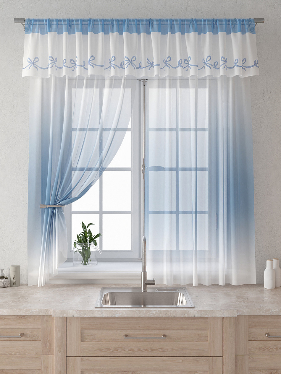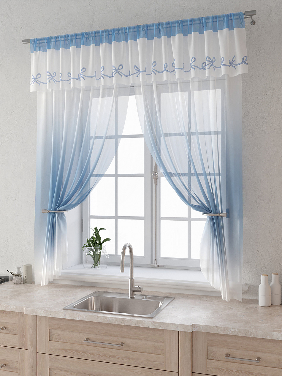 Вуаль 150х160 см. — 2 шт., Ламбрекен 300х40 см. — 1 шт. Комплект штор из вуали оформлены печатным рисунком. Печатный рисунок дает широкие возможности обновить интерьер фактически не требуя ремонта за счет огромного выбора. Ткани с печатным рисунком безопасны и не содержат токсичных веществ. Не смотря на то, что материал легкий, он имеет высокую плотность, мало загрязнятся и не требует особого ухода даже после стирки, что важно для кухонных занавесок. Тюль не выцветает, не растягивается, превосходно драпируются, образуя струящиеся складки. Прекрасное решение для создания красоты и уюта с помощью уникальных дизайнов.