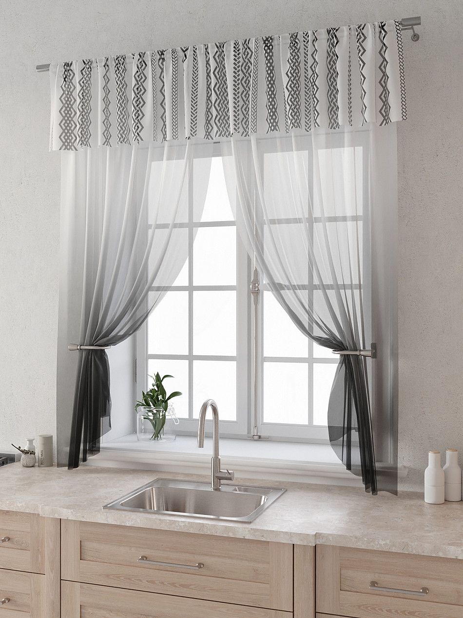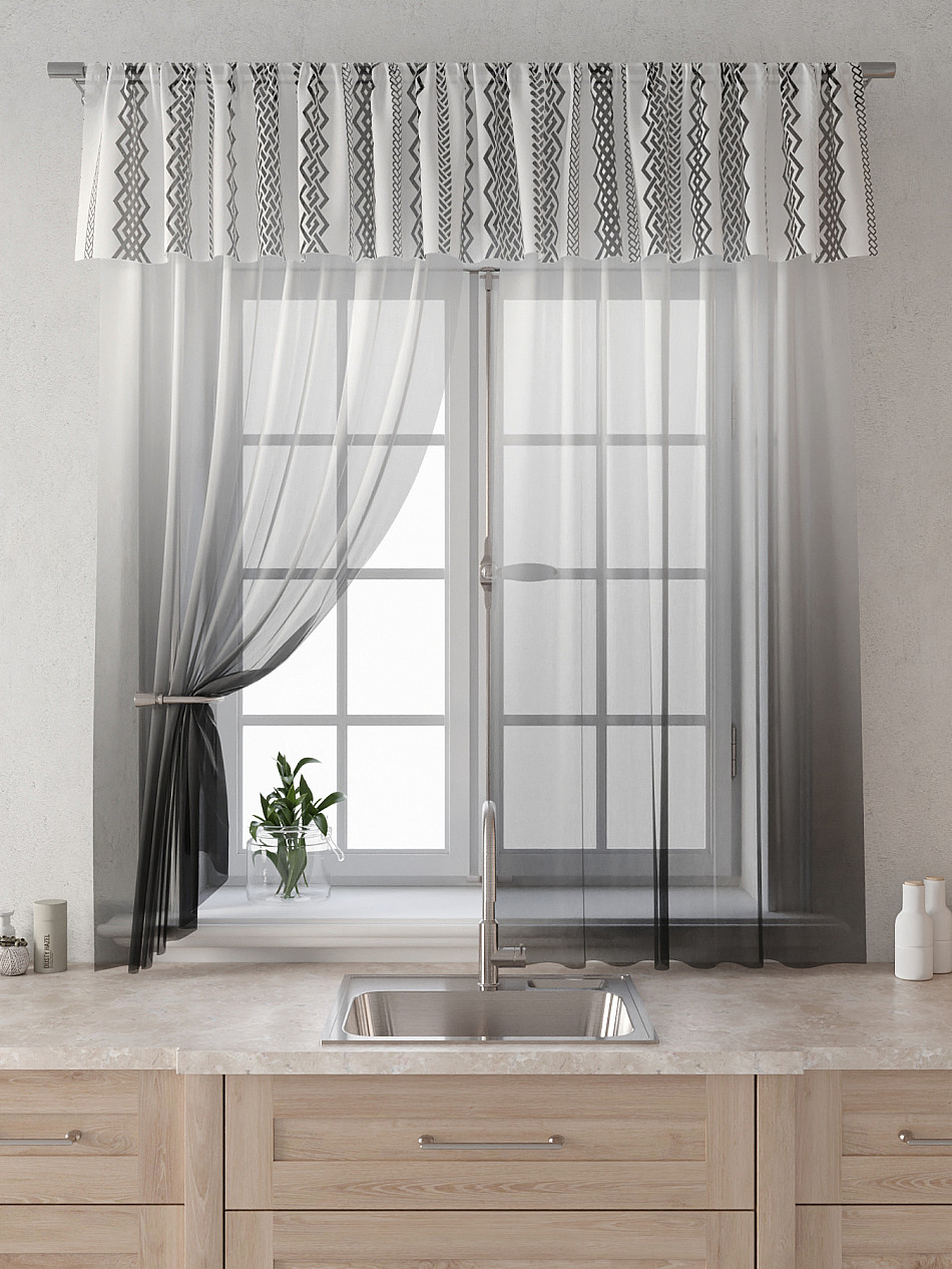 Вуаль 150х180 см. — 2 шт., Ламбрекен 300х40 см. — 1 шт. Комплект штор из вуали оформлены печатным рисунком. Печатный рисунок дает широкие возможности обновить интерьер фактически не требуя ремонта за счет огромного выбора. Ткани с печатным рисунком безопасны и не содержат токсичных веществ. Не смотря на то, что материал легкий, он имеет высокую плотность, мало загрязнятся и не требует особого ухода даже после стирки, что важно для кухонных занавесок. Тюль не выцветает, не растягивается, превосходно драпируются, образуя струящиеся складки. Прекрасное решение для создания красоты и уюта с помощью уникальных дизайнов.