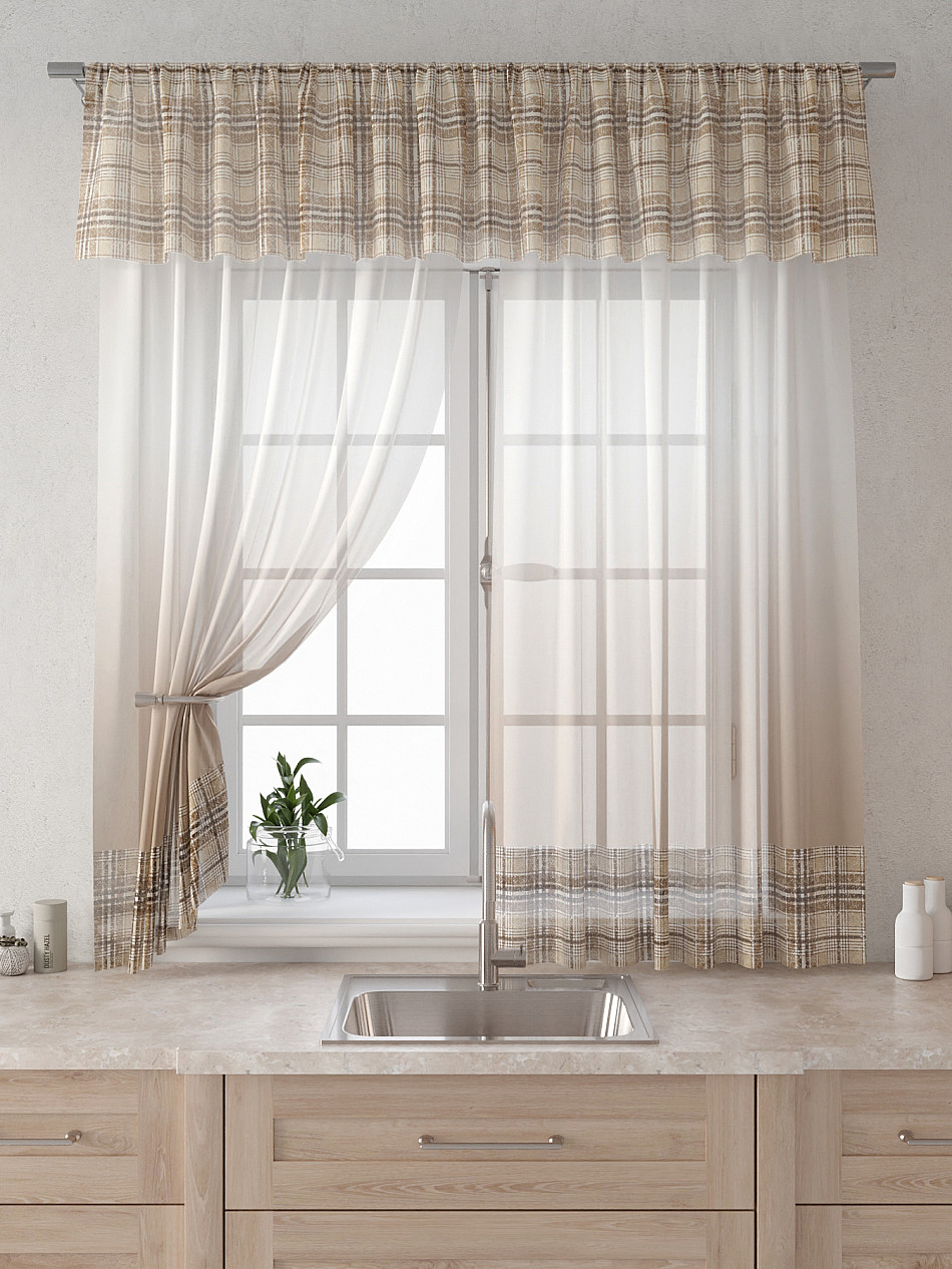 Вуаль 150х180 см. — 2 шт., Ламбрекен 300х40 см. — 1 шт. Комплект штор из вуали оформлены печатным рисунком. Печатный рисунок дает широкие возможности обновить интерьер фактически не требуя ремонта за счет огромного выбора. Ткани с печатным рисунком безопасны и не содержат токсичных веществ. Не смотря на то, что материал легкий, он имеет высокую плотность, мало загрязнятся и не требует особого ухода даже после стирки, что важно для кухонных занавесок. Тюль не выцветает, не растягивается, превосходно драпируются, образуя струящиеся складки. Прекрасное решение для создания красоты и уюта с помощью уникальных дизайнов.