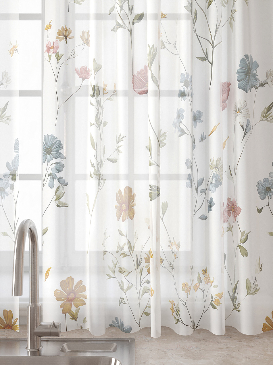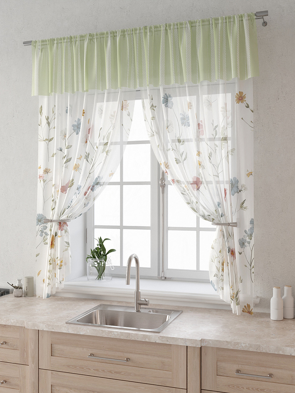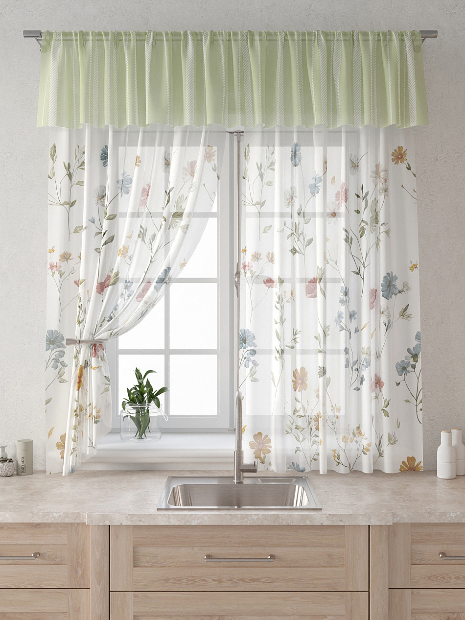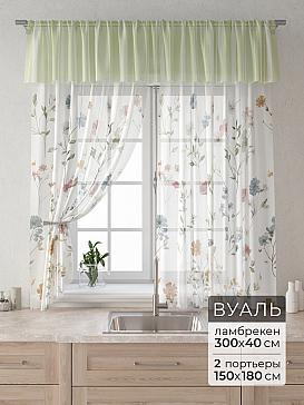 Вуаль 150х180 см. — 2 шт., Ламбрекен 300х40 см. — 1 шт. Комплект штор из вуали оформлены печатным рисунком. Печатный рисунок дает широкие возможности обновить интерьер фактически не требуя ремонта за счет огромного выбора. Ткани с печатным рисунком безопасны и не содержат токсичных веществ. Не смотря на то, что материал легкий, он имеет высокую плотность, мало загрязнятся и не требует особого ухода даже после стирки, что важно для кухонных занавесок. Тюль не выцветает, не растягивается, превосходно драпируются, образуя струящиеся складки. Прекрасное решение для создания красоты и уюта с помощью уникальных дизайнов.