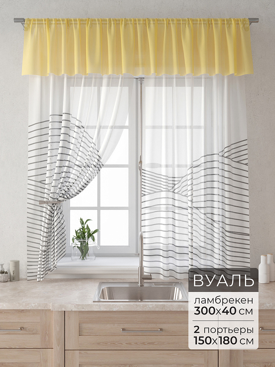 - Состав комплекта Вуаль 150х180 см — 2 шт., Ламбрекен 300х40 см — 1 шт.