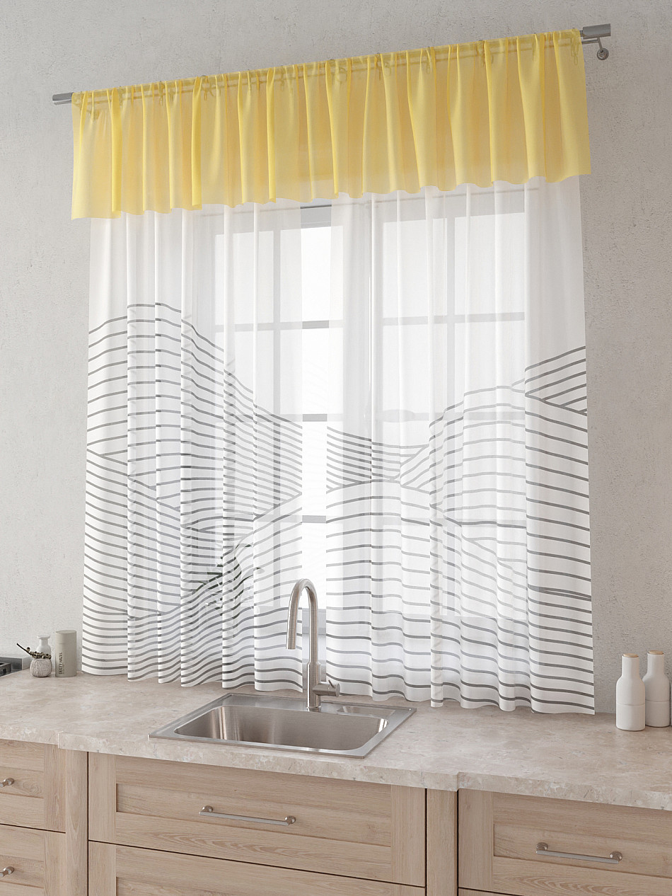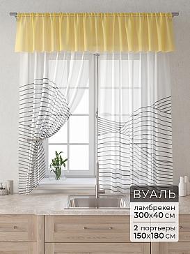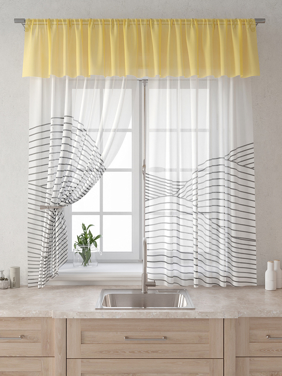 Вуаль 150х180 см. — 2 шт., Ламбрекен 300х40 см. — 1 шт. Комплект штор из вуали оформлены печатным рисунком. Печатный рисунок дает широкие возможности обновить интерьер фактически не требуя ремонта за счет огромного выбора. Ткани с печатным рисунком безопасны и не содержат токсичных веществ. Не смотря на то, что материал легкий, он имеет высокую плотность, мало загрязнятся и не требует особого ухода даже после стирки, что важно для кухонных занавесок. Тюль не выцветает, не растягивается, превосходно драпируются, образуя струящиеся складки. Прекрасное решение для создания красоты и уюта с помощью уникальных дизайнов.