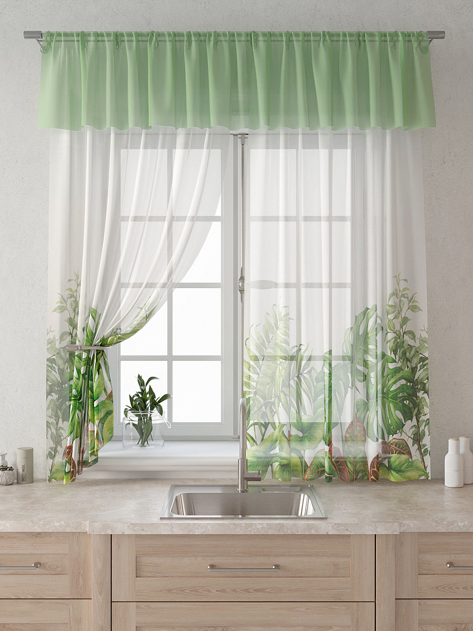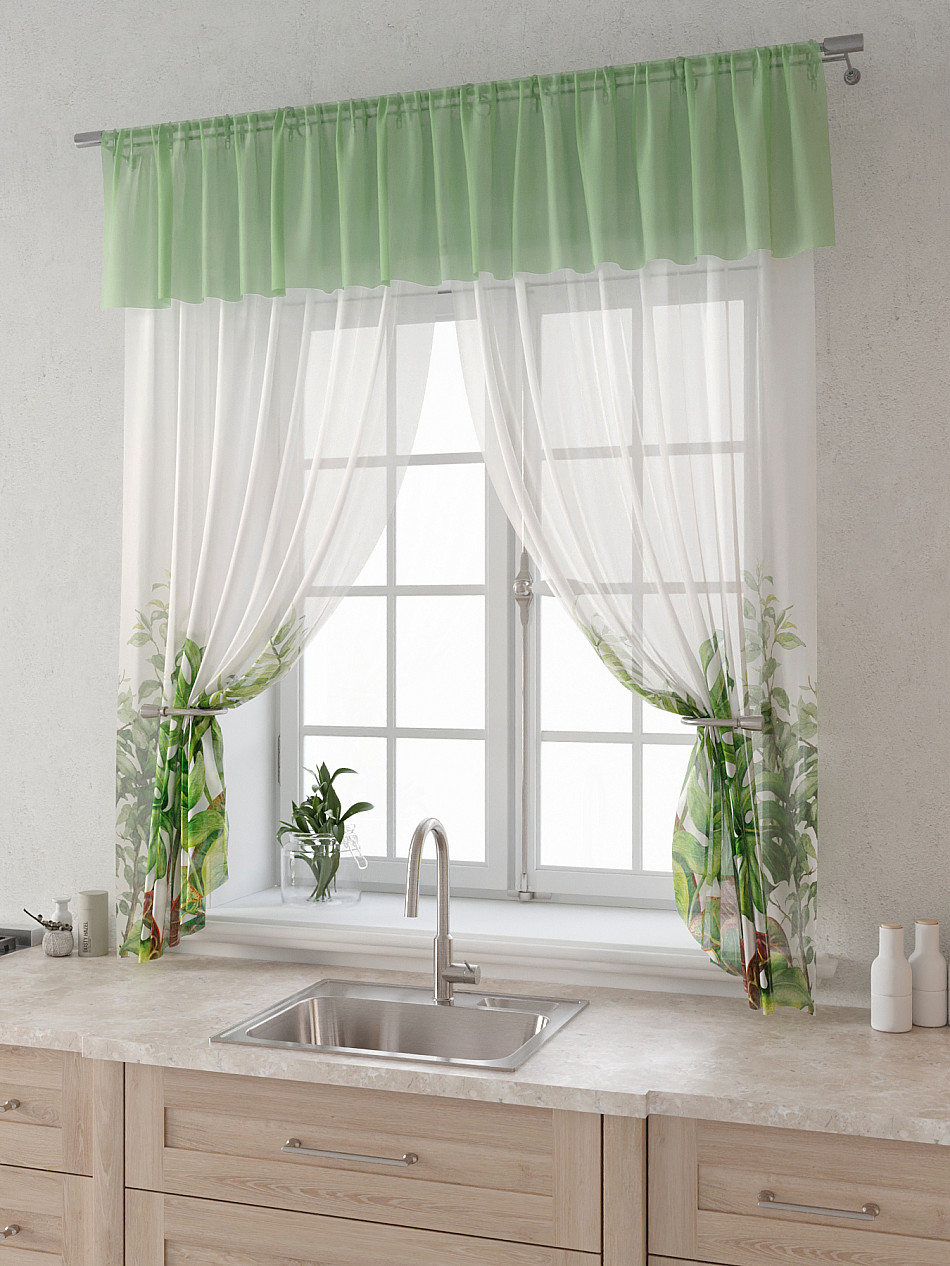 Вуаль 150х180 см. — 2 шт., Ламбрекен 300х40 см. — 1 шт. Комплект штор из вуали оформлены печатным рисунком. Печатный рисунок дает широкие возможности обновить интерьер фактически не требуя ремонта за счет огромного выбора. Ткани с печатным рисунком безопасны и не содержат токсичных веществ. Не смотря на то, что материал легкий, он имеет высокую плотность, мало загрязнятся и не требует особого ухода даже после стирки, что важно для кухонных занавесок. Тюль не выцветает, не растягивается, превосходно драпируются, образуя струящиеся складки. Прекрасное решение для создания красоты и уюта с помощью уникальных дизайнов.
