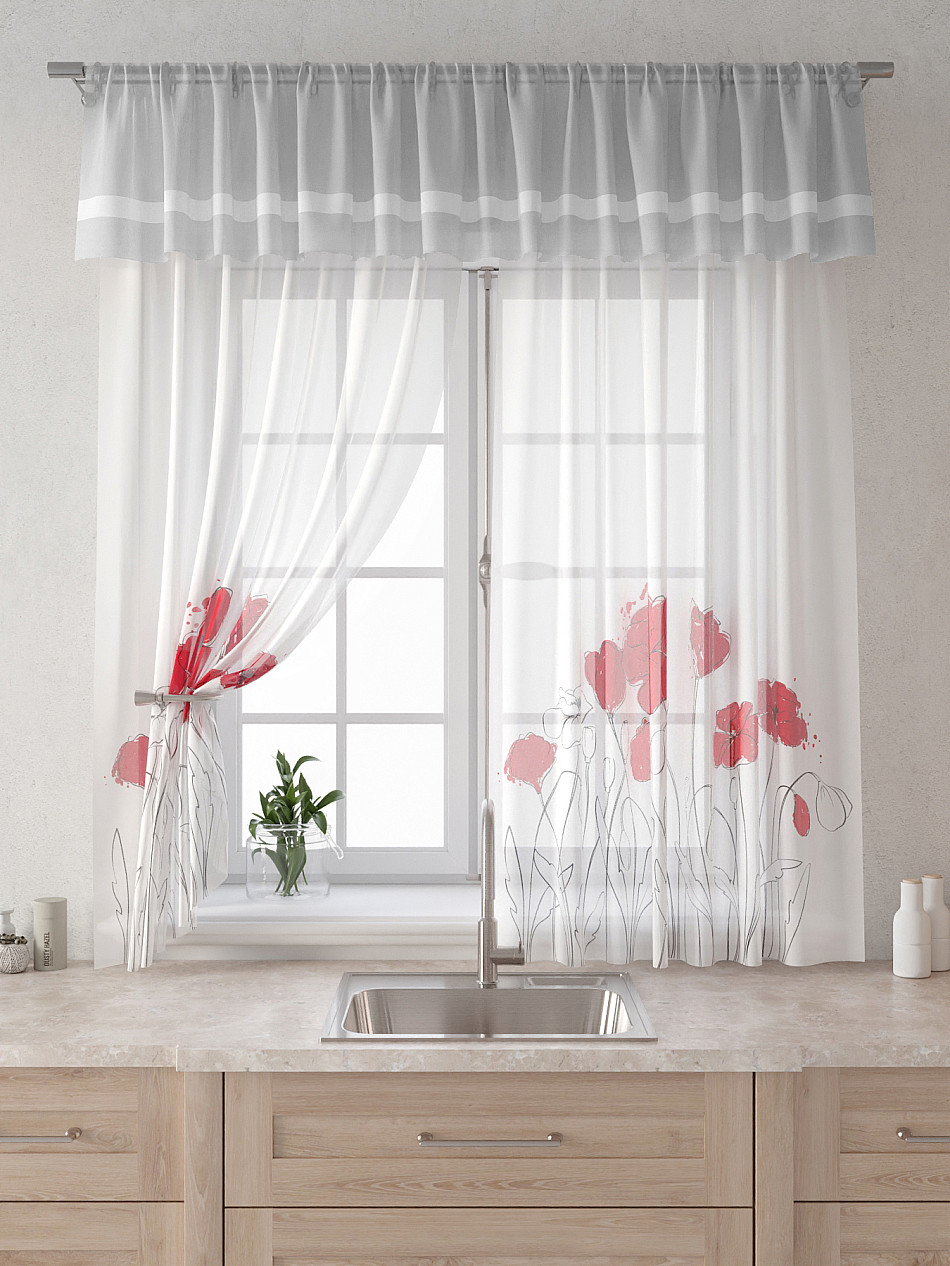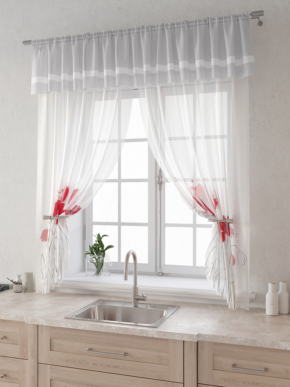 Вуаль 150х180 см. — 2 шт., Ламбрекен 300х40 см. — 1 шт. Комплект штор из вуали оформлены печатным рисунком. Печатный рисунок дает широкие возможности обновить интерьер фактически не требуя ремонта за счет огромного выбора. Ткани с печатным рисунком безопасны и не содержат токсичных веществ. Не смотря на то, что материал легкий, он имеет высокую плотность, мало загрязнятся и не требует особого ухода даже после стирки, что важно для кухонных занавесок. Тюль не выцветает, не растягивается, превосходно драпируются, образуя струящиеся складки. Прекрасное решение для создания красоты и уюта с помощью уникальных дизайнов.