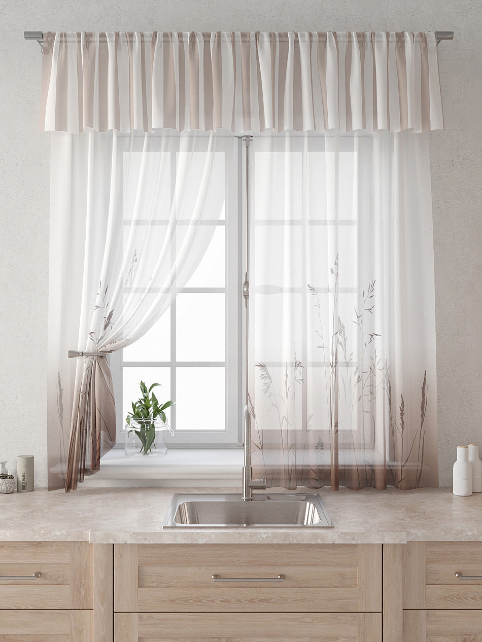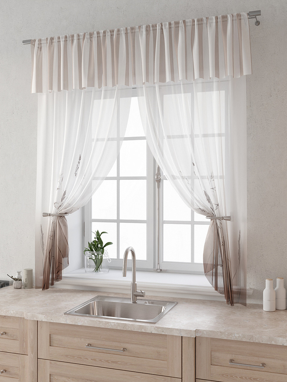 Вуаль 150х160 см. — 2 шт., Ламбрекен 300х40 см. — 1 шт. Комплект штор из вуали оформлены печатным рисунком. Печатный рисунок дает широкие возможности обновить интерьер фактически не требуя ремонта за счет огромного выбора. Ткани с печатным рисунком безопасны и не содержат токсичных веществ. Не смотря на то, что материал легкий, он имеет высокую плотность, мало загрязнятся и не требует особого ухода даже после стирки, что важно для кухонных занавесок. Тюль не выцветает, не растягивается, превосходно драпируются, образуя струящиеся складки. Прекрасное решение для создания красоты и уюта с помощью уникальных дизайнов.