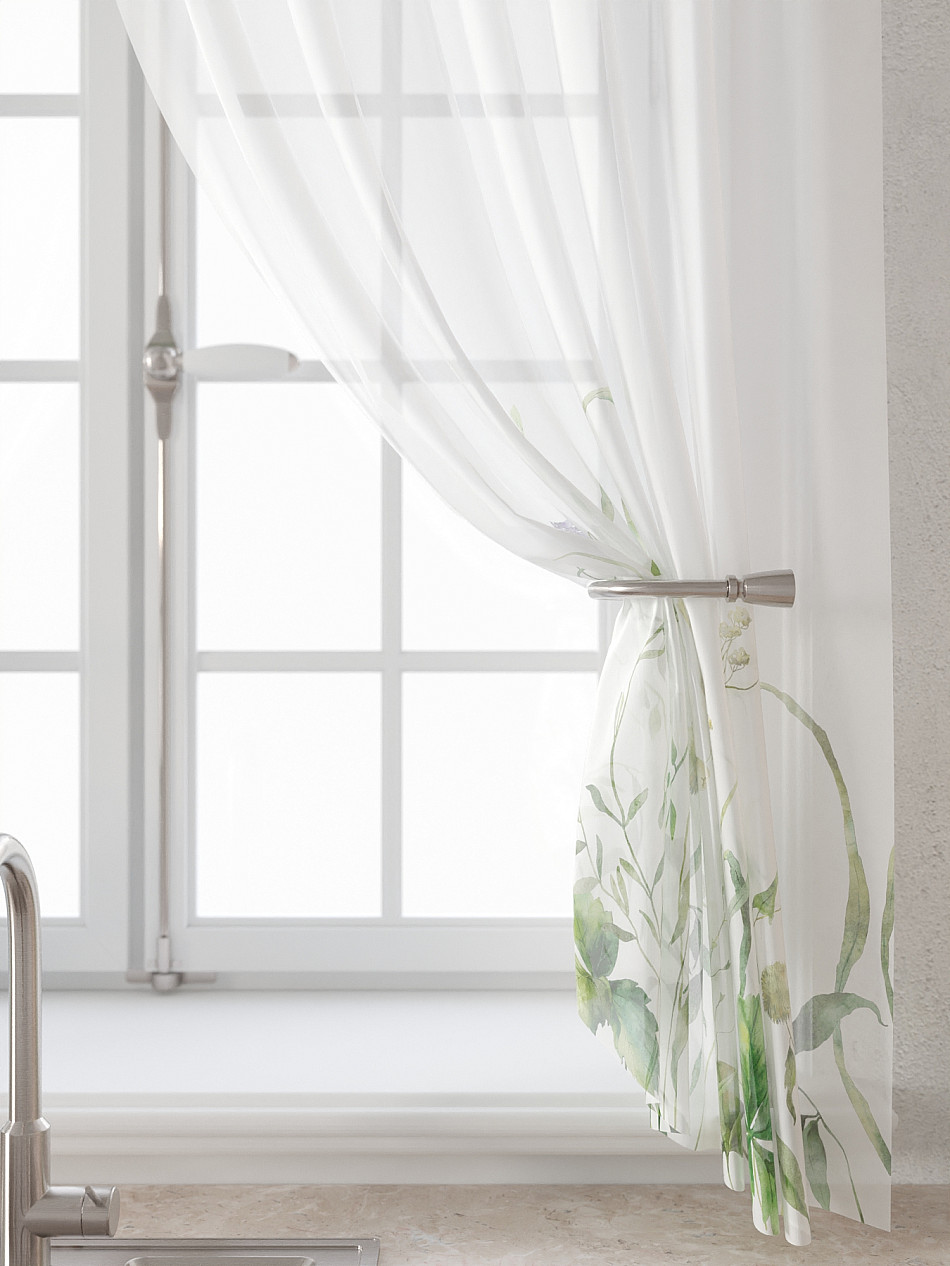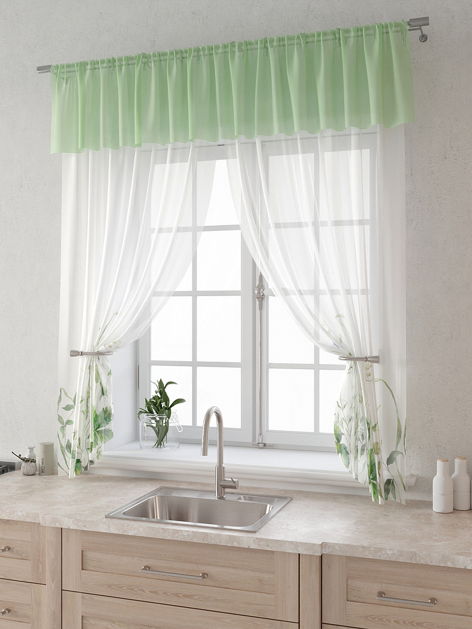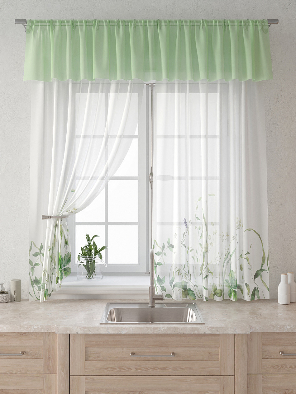 Вуаль 150х180 см. — 2 шт., Ламбрекен 300х40 см. — 1 шт. Комплект штор из вуали оформлены печатным рисунком. Печатный рисунок дает широкие возможности обновить интерьер фактически не требуя ремонта за счет огромного выбора. Ткани с печатным рисунком безопасны и не содержат токсичных веществ. Не смотря на то, что материал легкий, он имеет высокую плотность, мало загрязнятся и не требует особого ухода даже после стирки, что важно для кухонных занавесок. Тюль не выцветает, не растягивается, превосходно драпируются, образуя струящиеся складки. Прекрасное решение для создания красоты и уюта с помощью уникальных дизайнов.