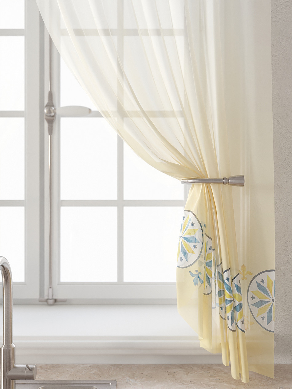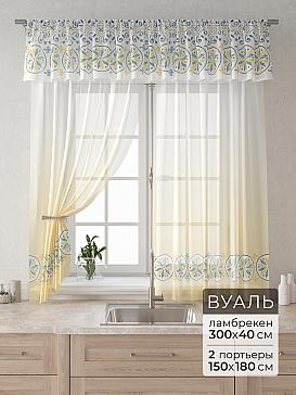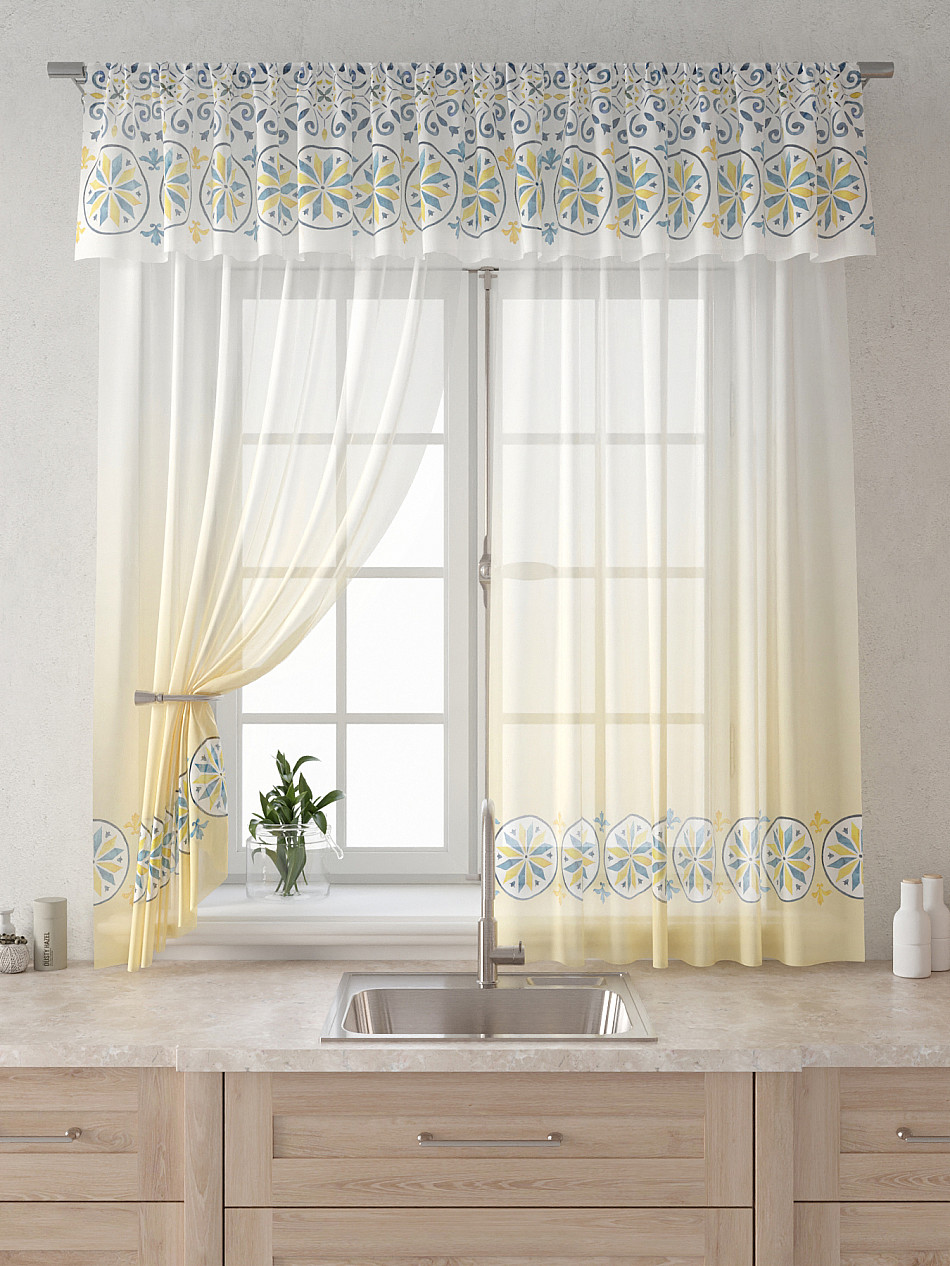 Вуаль 150х180 см. — 2 шт., Ламбрекен 300х40 см. — 1 шт. Комплект штор из вуали оформлены печатным рисунком. Печатный рисунок дает широкие возможности обновить интерьер фактически не требуя ремонта за счет огромного выбора. Ткани с печатным рисунком безопасны и не содержат токсичных веществ. Не смотря на то, что материал легкий, он имеет высокую плотность, мало загрязнятся и не требует особого ухода даже после стирки, что важно для кухонных занавесок. Тюль не выцветает, не растягивается, превосходно драпируются, образуя струящиеся складки. Прекрасное решение для создания красоты и уюта с помощью уникальных дизайнов.