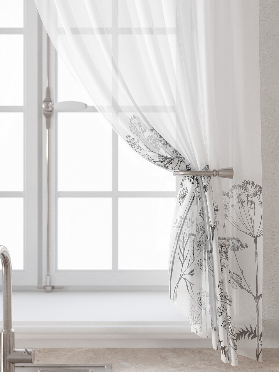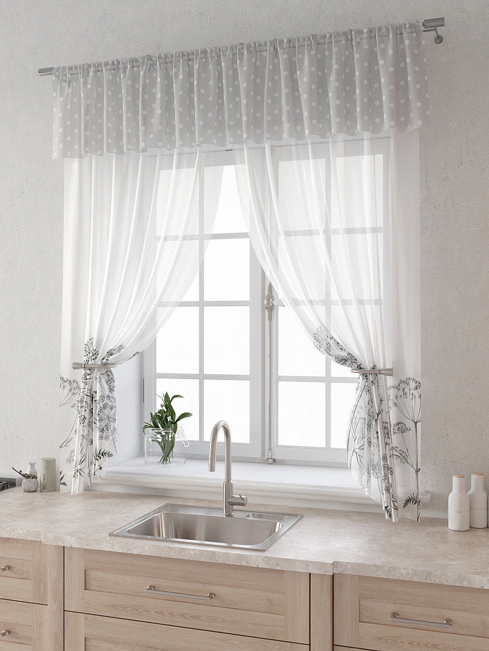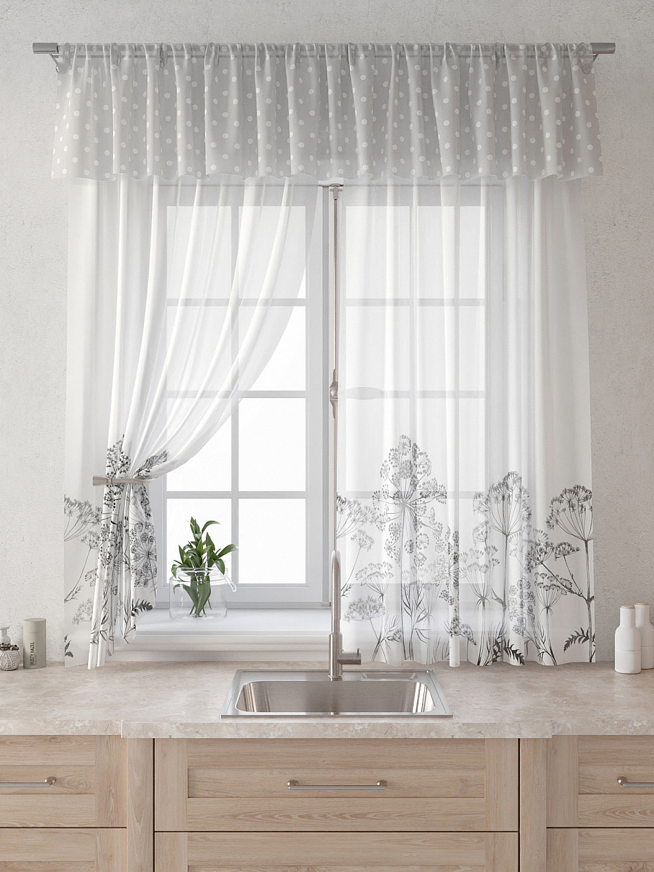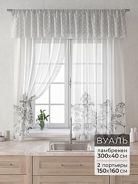 Вуаль 150х160 см. — 2 шт., Ламбрекен 300х40 см. — 1 шт. Комплект штор из вуали оформлены печатным рисунком. Печатный рисунок дает широкие возможности обновить интерьер фактически не требуя ремонта за счет огромного выбора. Ткани с печатным рисунком безопасны и не содержат токсичных веществ. Не смотря на то, что материал легкий, он имеет высокую плотность, мало загрязнятся и не требует особого ухода даже после стирки, что важно для кухонных занавесок. Тюль не выцветает, не растягивается, превосходно драпируются, образуя струящиеся складки. Прекрасное решение для создания красоты и уюта с помощью уникальных дизайнов.