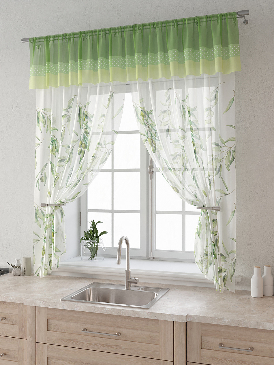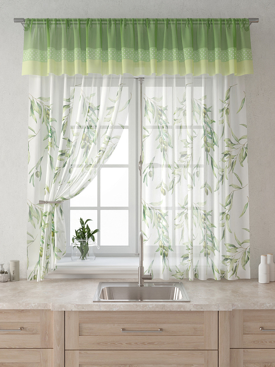 Вуаль 150х160 см. — 2 шт., Ламбрекен 300х40 см. — 1 шт. Комплект штор из вуали оформлены печатным рисунком. Печатный рисунок дает широкие возможности обновить интерьер фактически не требуя ремонта за счет огромного выбора. Ткани с печатным рисунком безопасны и не содержат токсичных веществ. Не смотря на то, что материал легкий, он имеет высокую плотность, мало загрязнятся и не требует особого ухода даже после стирки, что важно для кухонных занавесок. Тюль не выцветает, не растягивается, превосходно драпируются, образуя струящиеся складки. Прекрасное решение для создания красоты и уюта с помощью уникальных дизайнов.