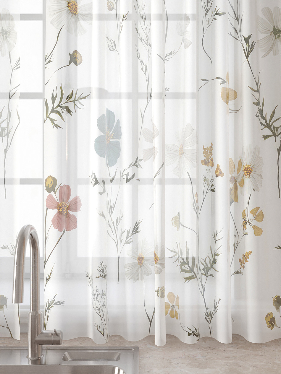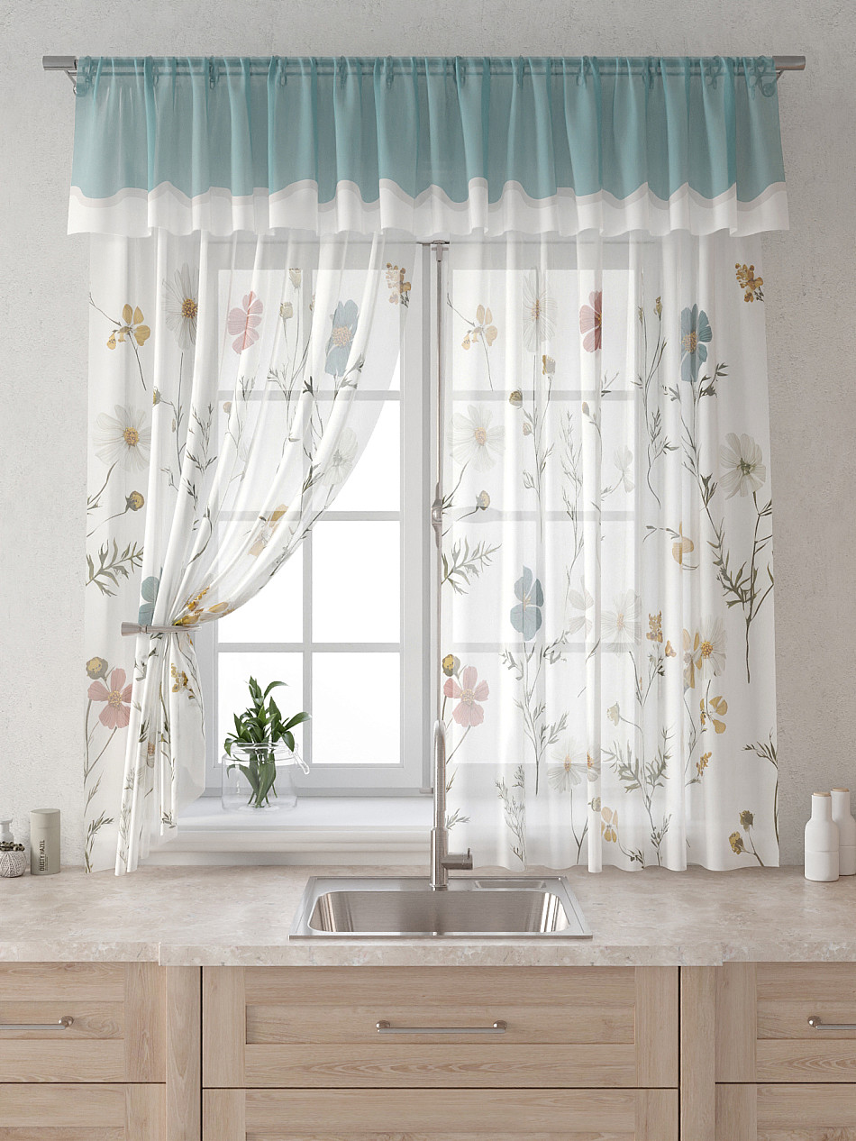Вуаль 150х160 см. — 2 шт., Ламбрекен 300х40 см. — 1 шт. Комплект штор из вуали оформлены печатным рисунком. Печатный рисунок дает широкие возможности обновить интерьер фактически не требуя ремонта за счет огромного выбора. Ткани с печатным рисунком безопасны и не содержат токсичных веществ. Не смотря на то, что материал легкий, он имеет высокую плотность, мало загрязнятся и не требует особого ухода даже после стирки, что важно для кухонных занавесок. Тюль не выцветает, не растягивается, превосходно драпируются, образуя струящиеся складки. Прекрасное решение для создания красоты и уюта с помощью уникальных дизайнов.