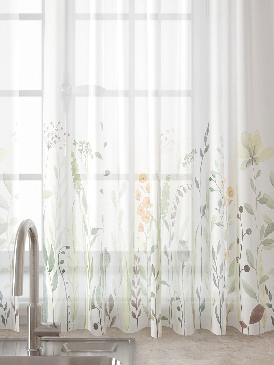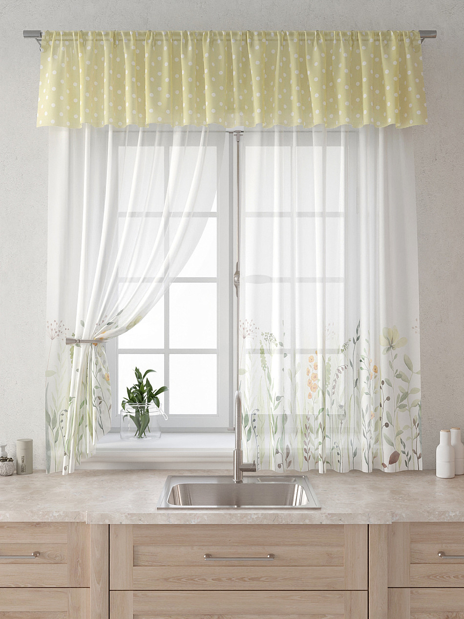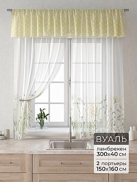 Вуаль 150х160 см. — 2 шт., Ламбрекен 300х40 см. — 1 шт. Комплект штор из вуали оформлены печатным рисунком. Печатный рисунок дает широкие возможности обновить интерьер фактически не требуя ремонта за счет огромного выбора. Ткани с печатным рисунком безопасны и не содержат токсичных веществ. Не смотря на то, что материал легкий, он имеет высокую плотность, мало загрязнятся и не требует особого ухода даже после стирки, что важно для кухонных занавесок. Тюль не выцветает, не растягивается, превосходно драпируются, образуя струящиеся складки. Прекрасное решение для создания красоты и уюта с помощью уникальных дизайнов.