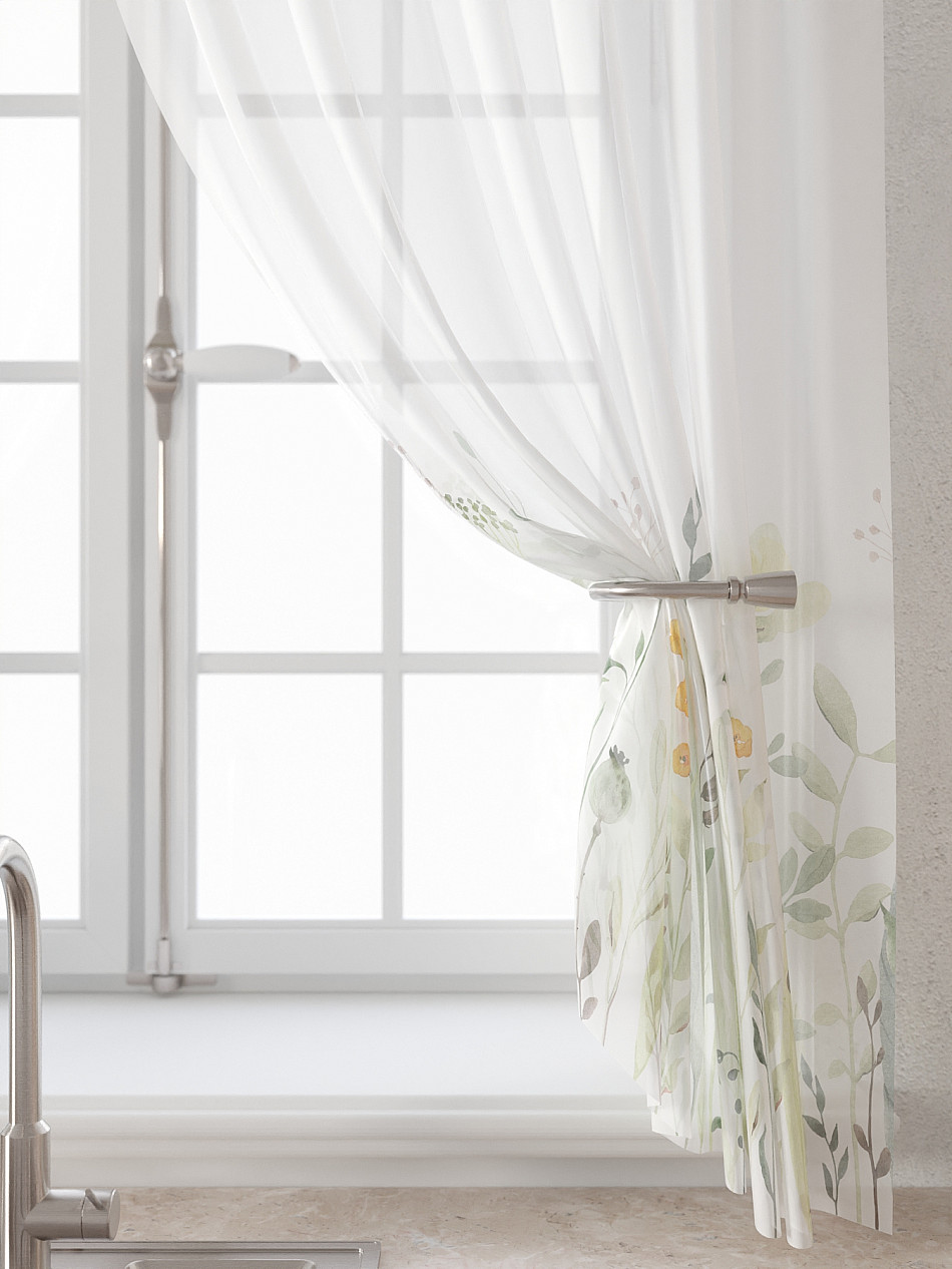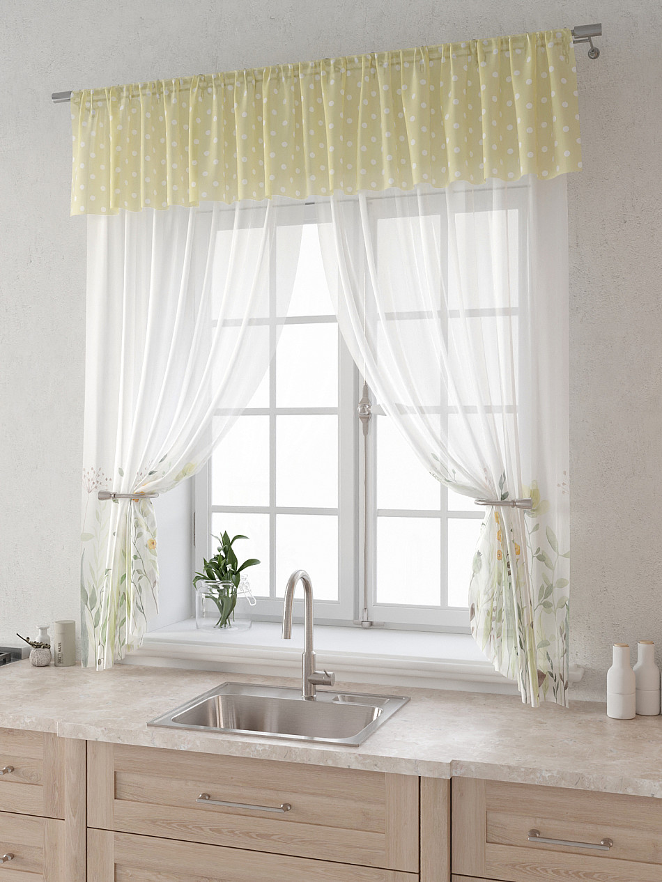 Вуаль 150х180 см. — 2 шт., Ламбрекен 300х40 см. — 1 шт. Комплект штор из вуали оформлены печатным рисунком. Печатный рисунок дает широкие возможности обновить интерьер фактически не требуя ремонта за счет огромного выбора. Ткани с печатным рисунком безопасны и не содержат токсичных веществ. Не смотря на то, что материал легкий, он имеет высокую плотность, мало загрязнятся и не требует особого ухода даже после стирки, что важно для кухонных занавесок. Тюль не выцветает, не растягивается, превосходно драпируются, образуя струящиеся складки. Прекрасное решение для создания красоты и уюта с помощью уникальных дизайнов.