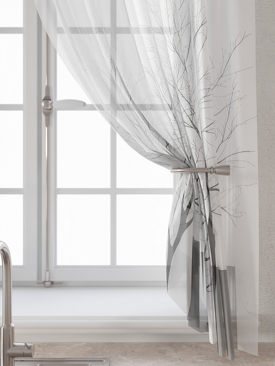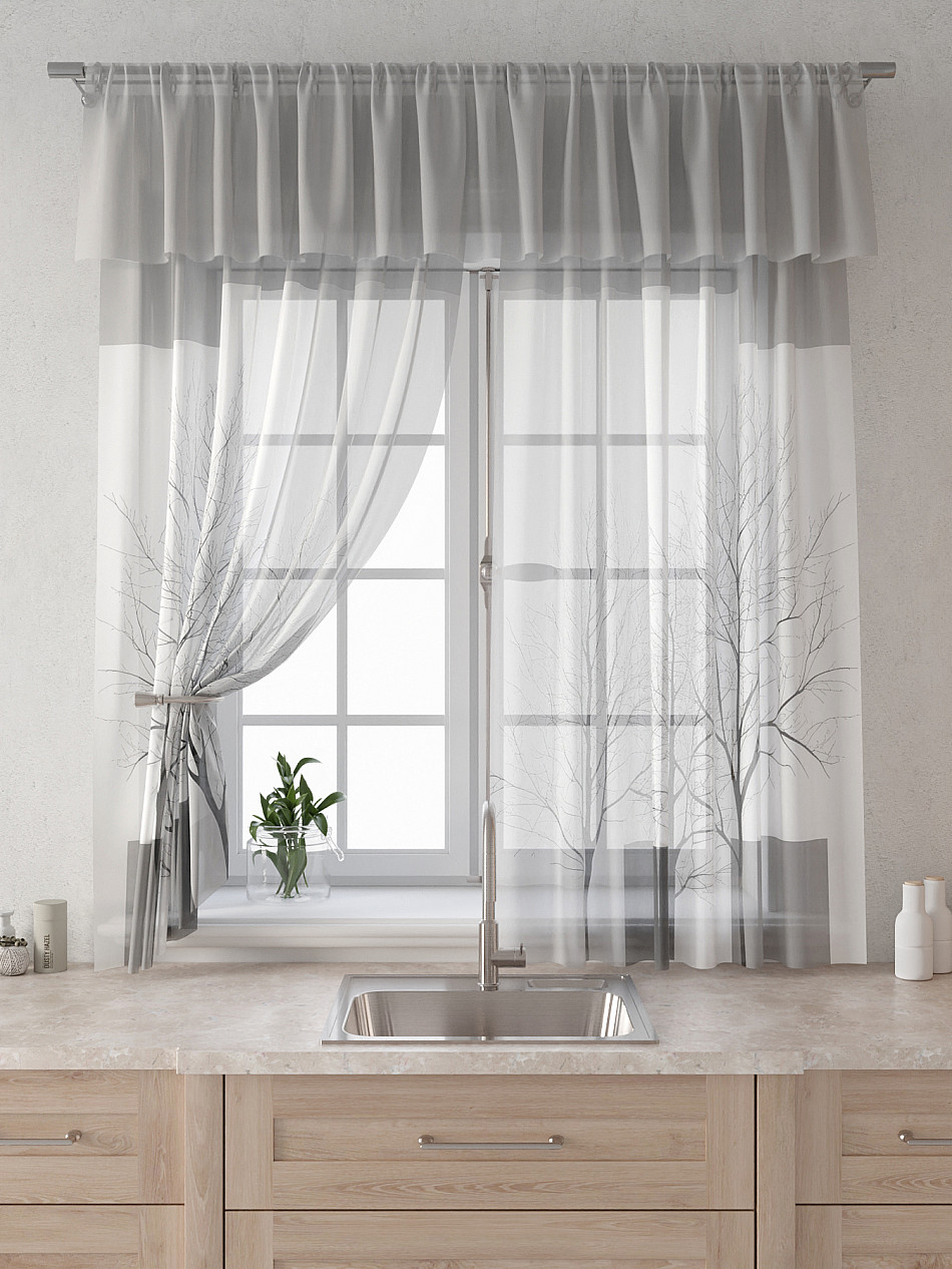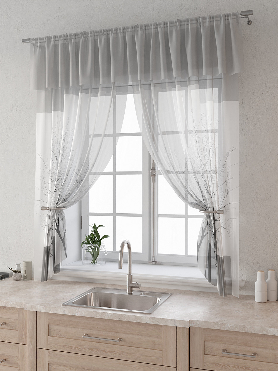 Вуаль 150х180 см. — 2 шт., Ламбрекен 300х40 см. — 1 шт. Комплект штор из вуали оформлены печатным рисунком. Печатный рисунок дает широкие возможности обновить интерьер фактически не требуя ремонта за счет огромного выбора. Ткани с печатным рисунком безопасны и не содержат токсичных веществ. Не смотря на то, что материал легкий, он имеет высокую плотность, мало загрязнятся и не требует особого ухода даже после стирки, что важно для кухонных занавесок. Тюль не выцветает, не растягивается, превосходно драпируются, образуя струящиеся складки. Прекрасное решение для создания красоты и уюта с помощью уникальных дизайнов.