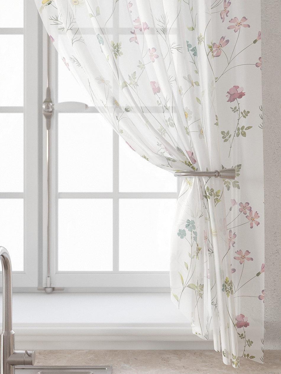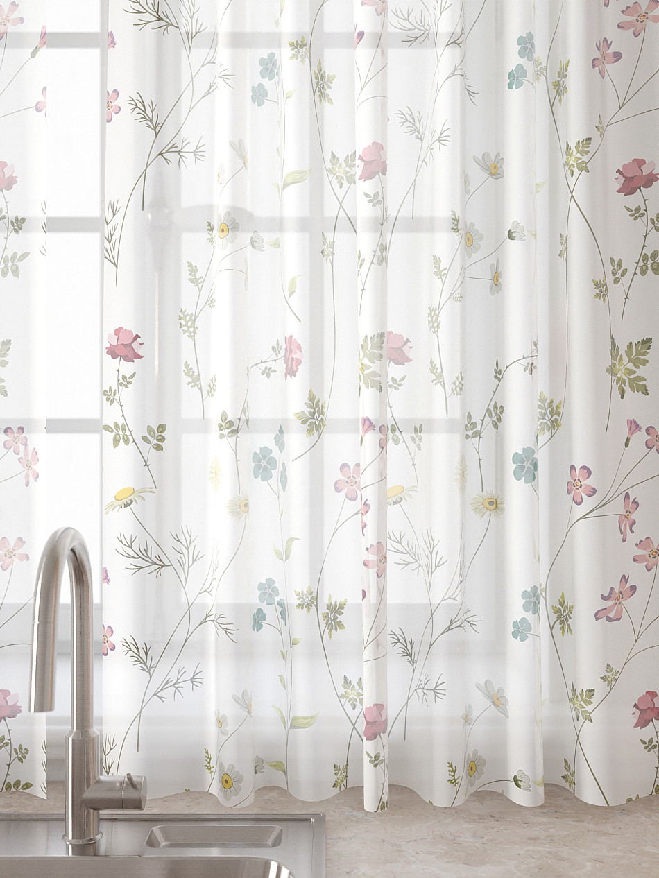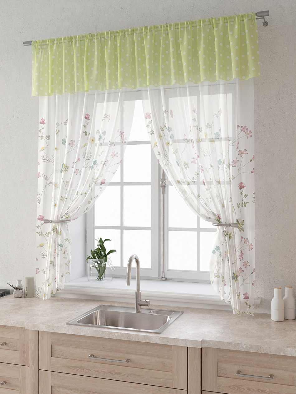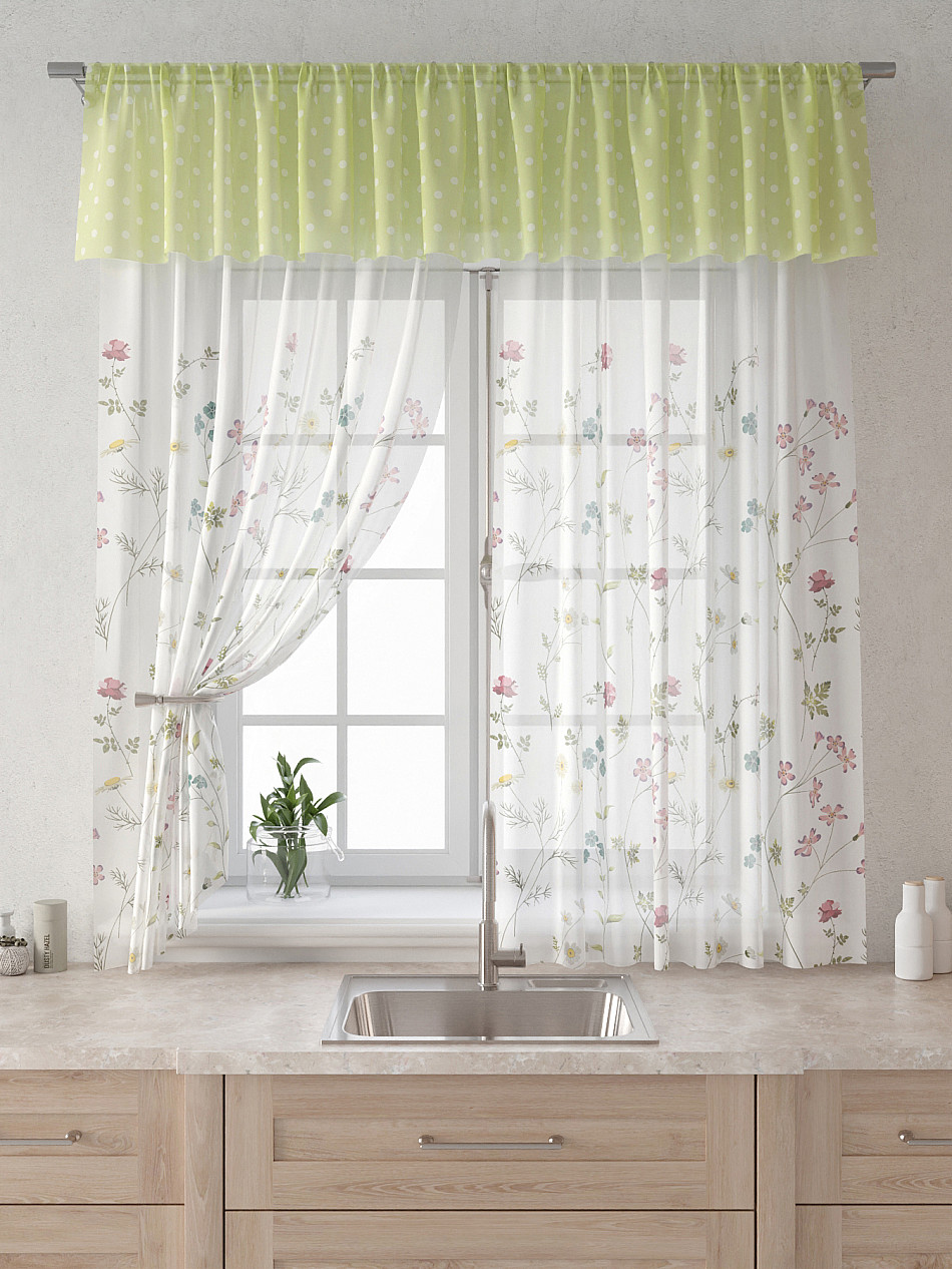 Вуаль 150х180 см. — 2 шт., Ламбрекен 300х40 см. — 1 шт. Комплект штор из вуали оформлены печатным рисунком. Печатный рисунок дает широкие возможности обновить интерьер фактически не требуя ремонта за счет огромного выбора. Ткани с печатным рисунком безопасны и не содержат токсичных веществ. Не смотря на то, что материал легкий, он имеет высокую плотность, мало загрязнятся и не требует особого ухода даже после стирки, что важно для кухонных занавесок. Тюль не выцветает, не растягивается, превосходно драпируются, образуя струящиеся складки. Прекрасное решение для создания красоты и уюта с помощью уникальных дизайнов.