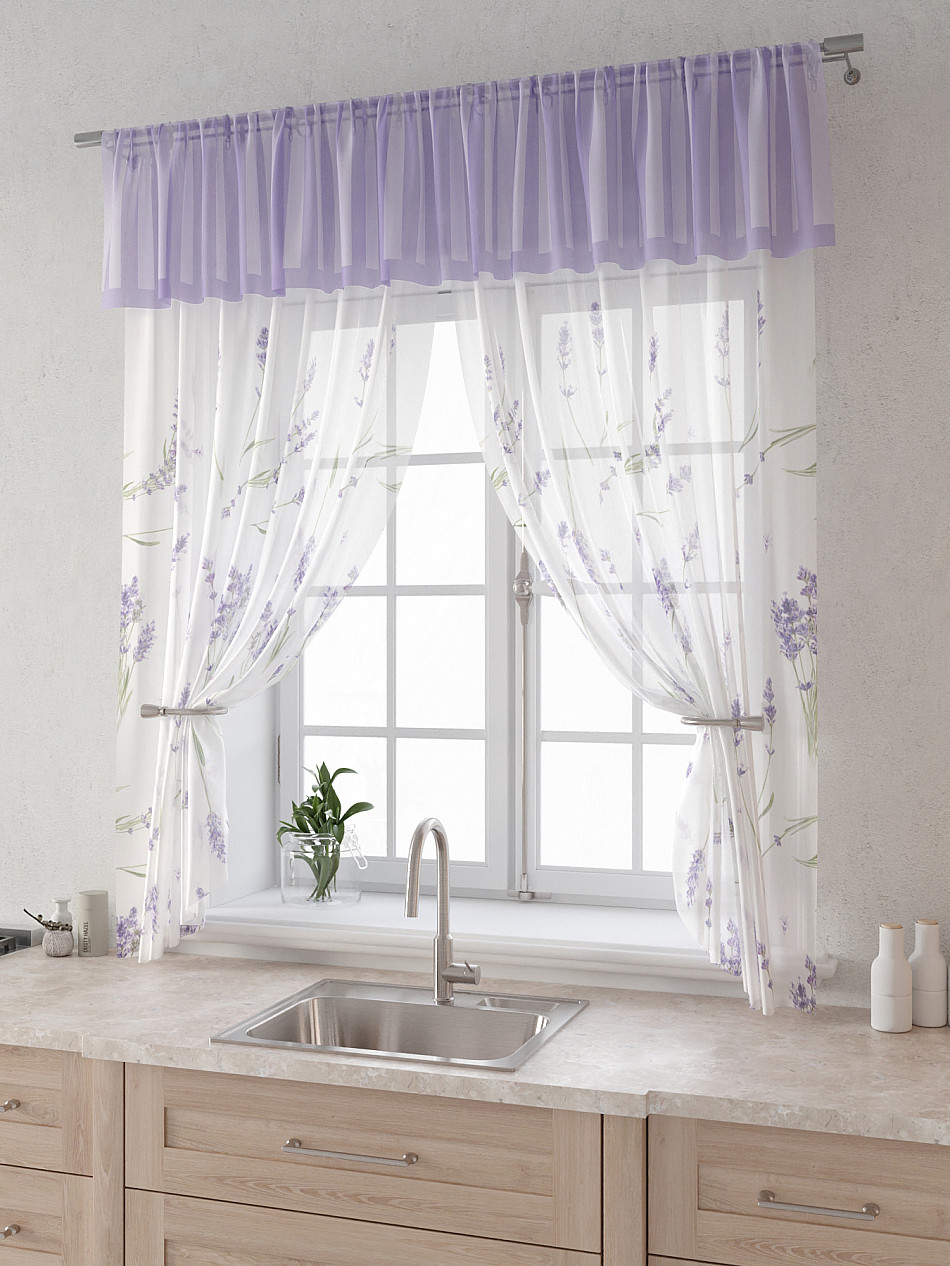 Вуаль 150х160 см. — 2 шт., Ламбрекен 300х40 см. — 1 шт. Комплект штор из вуали оформлены печатным рисунком. Печатный рисунок дает широкие возможности обновить интерьер фактически не требуя ремонта за счет огромного выбора. Ткани с печатным рисунком безопасны и не содержат токсичных веществ. Не смотря на то, что материал легкий, он имеет высокую плотность, мало загрязнятся и не требует особого ухода даже после стирки, что важно для кухонных занавесок. Тюль не выцветает, не растягивается, превосходно драпируются, образуя струящиеся складки. Прекрасное решение для создания красоты и уюта с помощью уникальных дизайнов.