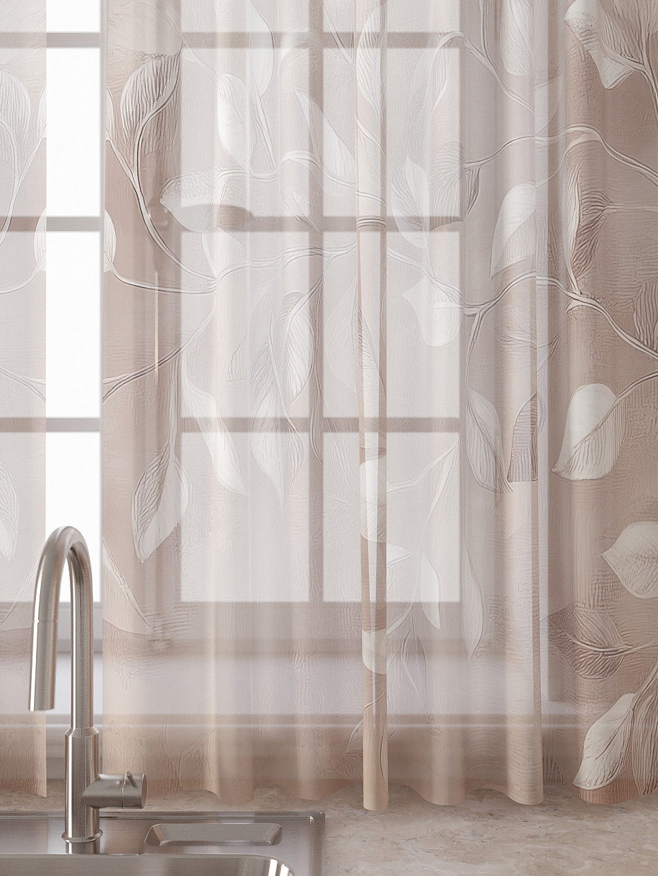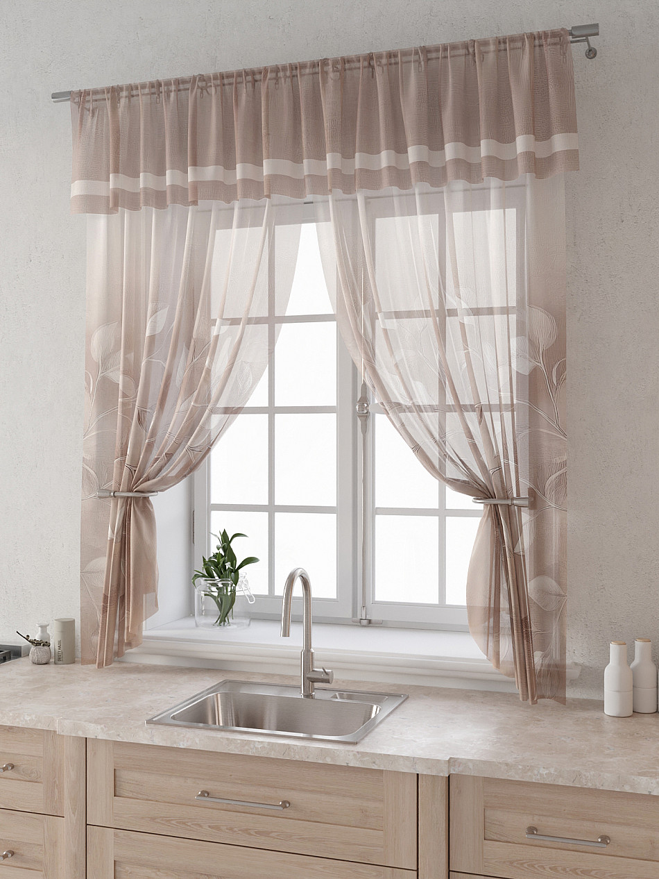 Вуаль 150х180 см. — 2 шт., Ламбрекен 300х40 см. — 1 шт. Комплект штор из вуали оформлены печатным рисунком. Печатный рисунок дает широкие возможности обновить интерьер фактически не требуя ремонта за счет огромного выбора. Ткани с печатным рисунком безопасны и не содержат токсичных веществ. Не смотря на то, что материал легкий, он имеет высокую плотность, мало загрязнятся и не требует особого ухода даже после стирки, что важно для кухонных занавесок. Тюль не выцветает, не растягивается, превосходно драпируются, образуя струящиеся складки. Прекрасное решение для создания красоты и уюта с помощью уникальных дизайнов.