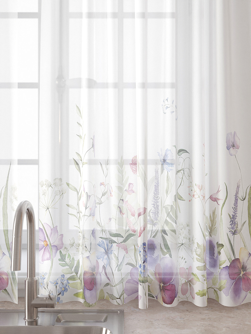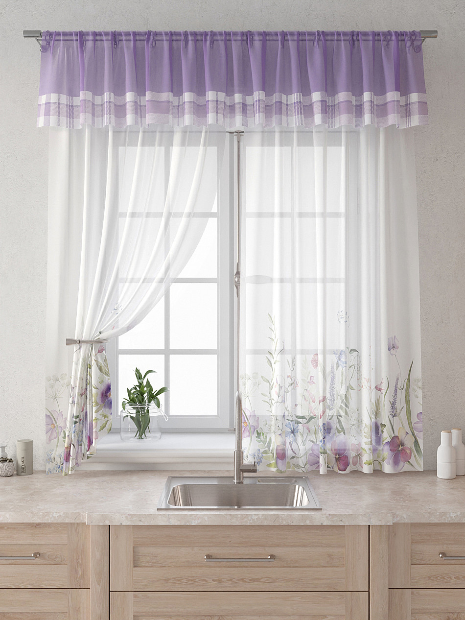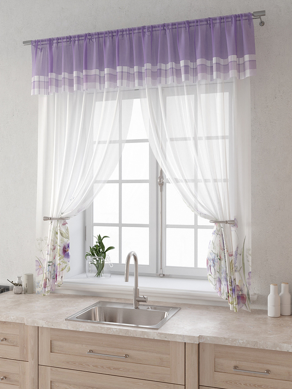 Вуаль 150х160 см. — 2 шт., Ламбрекен 300х40 см. — 1 шт. Комплект штор из вуали оформлены печатным рисунком. Печатный рисунок дает широкие возможности обновить интерьер фактически не требуя ремонта за счет огромного выбора. Ткани с печатным рисунком безопасны и не содержат токсичных веществ. Не смотря на то, что материал легкий, он имеет высокую плотность, мало загрязнятся и не требует особого ухода даже после стирки, что важно для кухонных занавесок. Тюль не выцветает, не растягивается, превосходно драпируются, образуя струящиеся складки. Прекрасное решение для создания красоты и уюта с помощью уникальных дизайнов.
