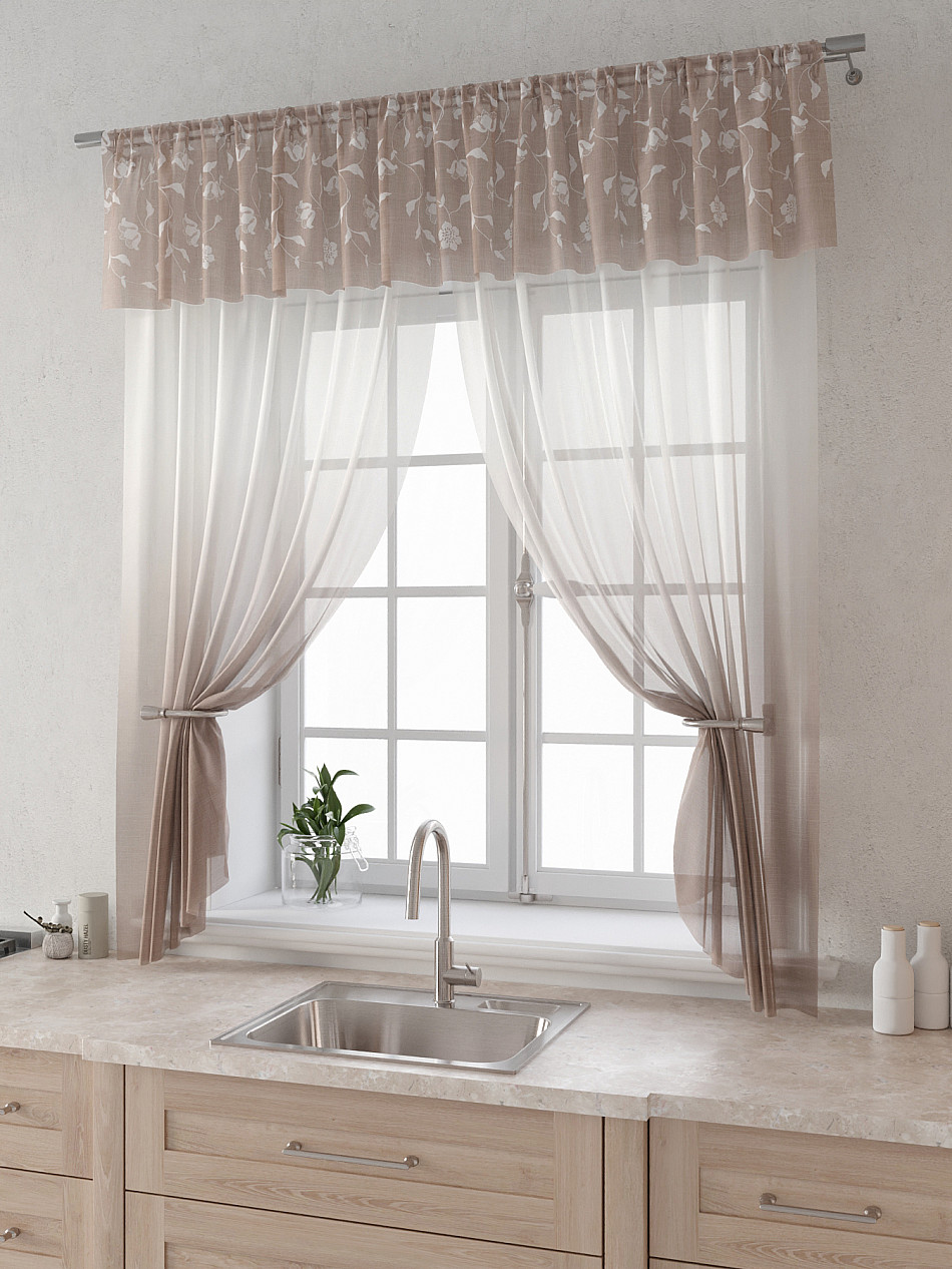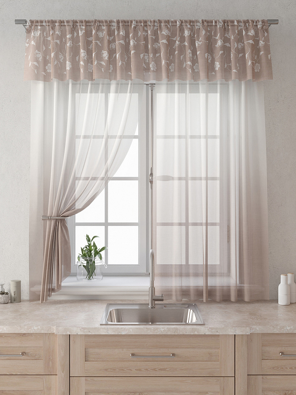 Вуаль 150х180 см. — 2 шт., Ламбрекен 300х40 см. — 1 шт. Комплект штор из вуали оформлены печатным рисунком. Печатный рисунок дает широкие возможности обновить интерьер фактически не требуя ремонта за счет огромного выбора. Ткани с печатным рисунком безопасны и не содержат токсичных веществ. Не смотря на то, что материал легкий, он имеет высокую плотность, мало загрязнятся и не требует особого ухода даже после стирки, что важно для кухонных занавесок. Тюль не выцветает, не растягивается, превосходно драпируются, образуя струящиеся складки. Прекрасное решение для создания красоты и уюта с помощью уникальных дизайнов.