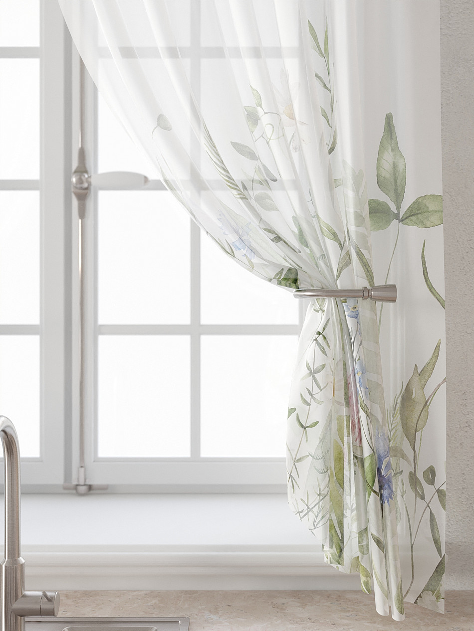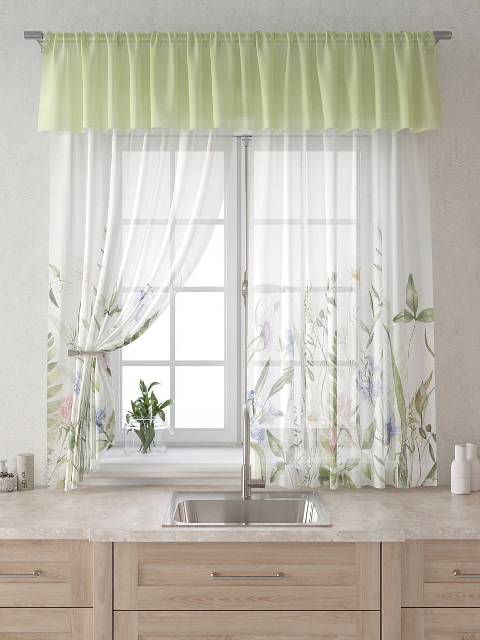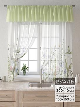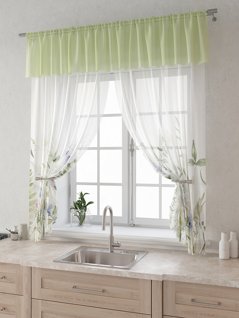 Вуаль 150х160 см. — 2 шт., Ламбрекен 300х40 см. — 1 шт. Комплект штор из вуали оформлены печатным рисунком. Печатный рисунок дает широкие возможности обновить интерьер фактически не требуя ремонта за счет огромного выбора. Ткани с печатным рисунком безопасны и не содержат токсичных веществ. Не смотря на то, что материал легкий, он имеет высокую плотность, мало загрязнятся и не требует особого ухода даже после стирки, что важно для кухонных занавесок. Тюль не выцветает, не растягивается, превосходно драпируются, образуя струящиеся складки. Прекрасное решение для создания красоты и уюта с помощью уникальных дизайнов.