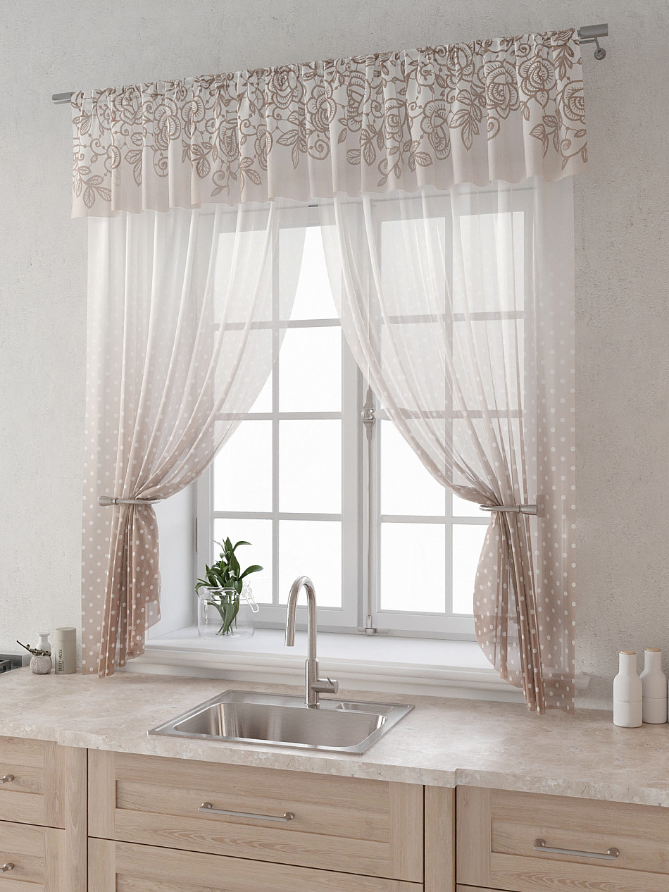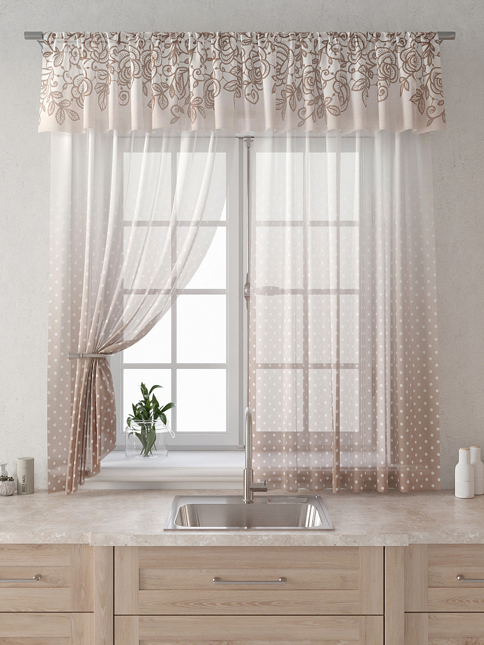 Вуаль 150х160 см. — 2 шт., Ламбрекен 300х40 см. — 1 шт. Комплект штор из вуали оформлены печатным рисунком. Печатный рисунок дает широкие возможности обновить интерьер фактически не требуя ремонта за счет огромного выбора. Ткани с печатным рисунком безопасны и не содержат токсичных веществ. Не смотря на то, что материал легкий, он имеет высокую плотность, мало загрязнятся и не требует особого ухода даже после стирки, что важно для кухонных занавесок. Тюль не выцветает, не растягивается, превосходно драпируются, образуя струящиеся складки. Прекрасное решение для создания красоты и уюта с помощью уникальных дизайнов.